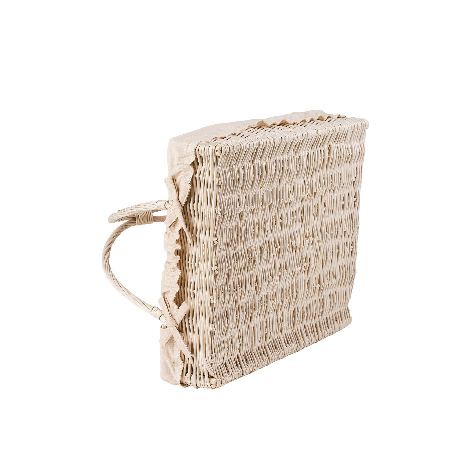 Elegancka, prostokątna taca z wikliny w jasnym, kremowym tonie zachwyca symetrią splotu i starannym wykończeniem. Wnętrze wyłożone jest kremowym, wyjmowanym obszyciem, które miękko otula krawędzie. Dwa solidne, łukowate uchwyty ułatwiają przenoszenie, a podniesione brzegi chronią zawartość przed zsuwaniem.