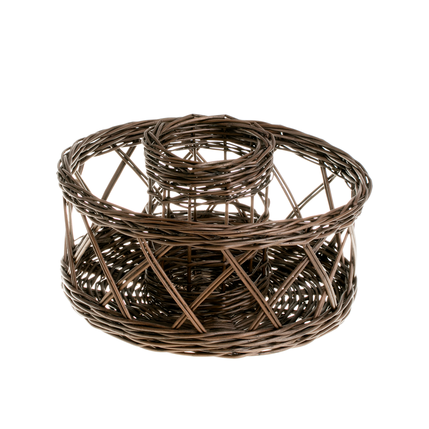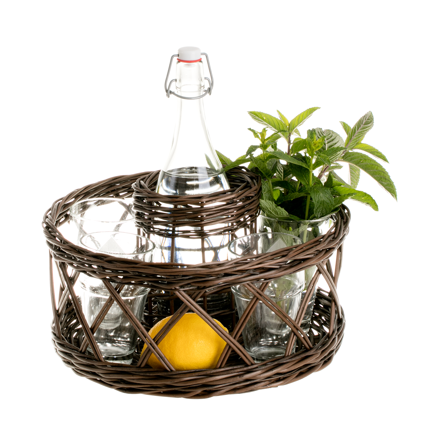 Elegancki organizer z naturalnej wikliny zachwyca dopracowanym detalem. Ma okrągłą sylwetkę w głębokim odcieniu wenge. Gęsto plecione dno i mocny, wielokrotnie zawijany rant gwarantują sztywność. Ażurowe ścianki ze skośnymi wzmocnieniami chronią zawartość. W centrum znajduje się podwyższony pierścień na butelkę, a wokół miejsce na kieliszki. Bez uchwytów i bez obszycia.