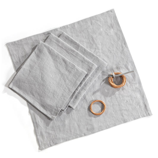 Elegancki zestaw stołowy łączy miękkie, szare serwetki z lniu 100% oraz naturalne pierścienie z wikliny. W komplecie otrzymujesz 4 serwetki o wymiarach 45 × 45 cm i 4 pierścienie o średnicy 6 cm. Delikatnie tkana faktura materiału pięknie układa się na talerzu, a ciepły, miodowy odcień wikliny dodaje stołowi subtelnego, naturalnego uroku. Starannie podwinięte brzegi i gładkie wykończenie zapewniają estetyczny wygląd przy każdym nakryciu.
