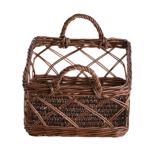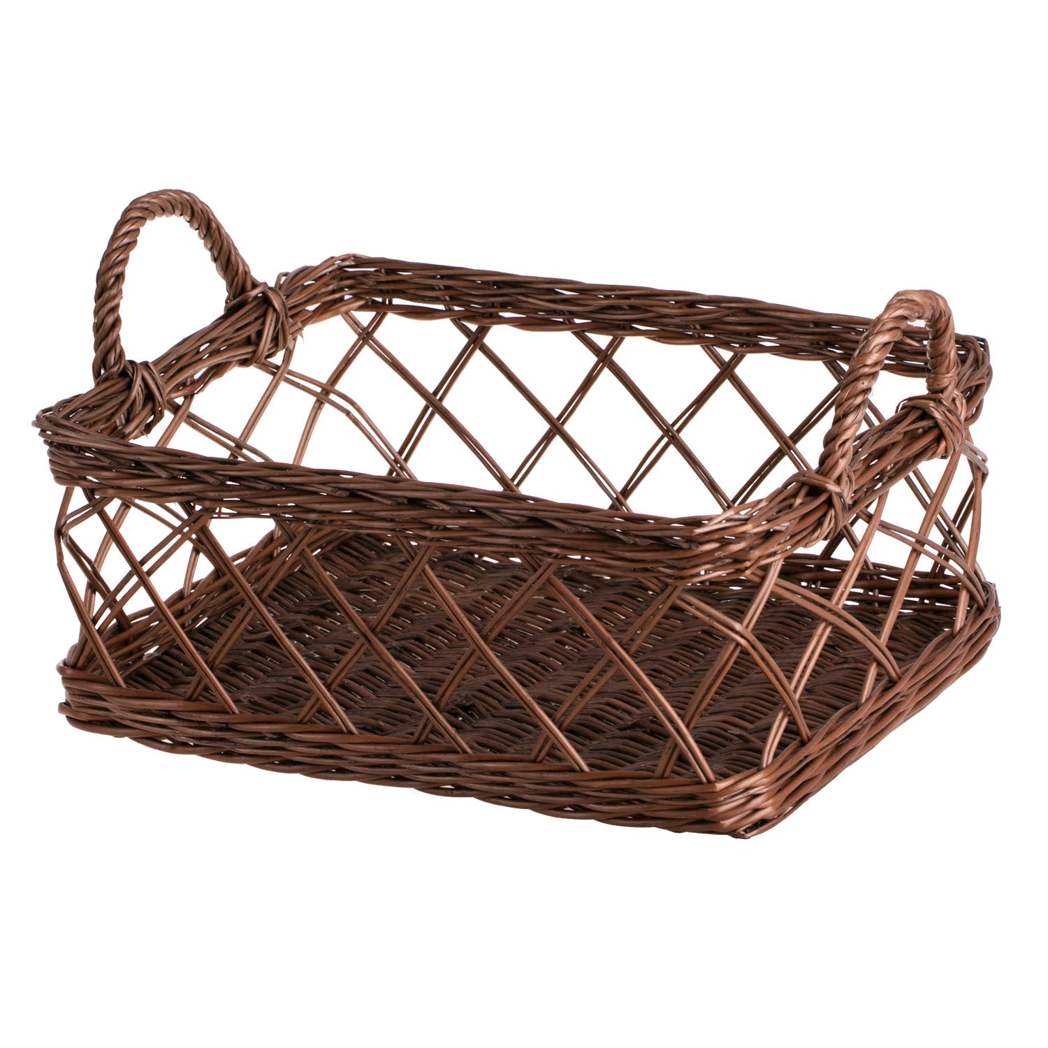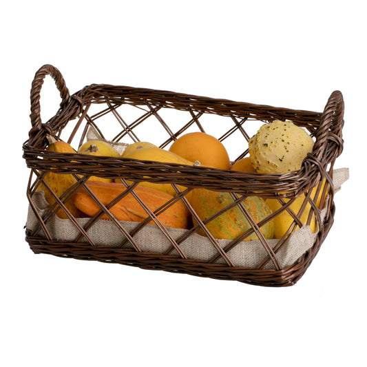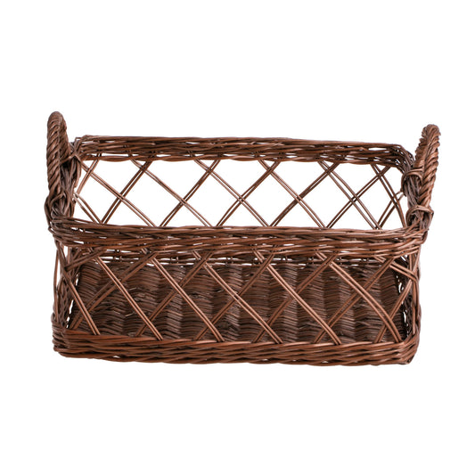Elegancka taca z wikliny w odcieniu ciemnego brązu zachwyca dopracowanymi detalami. Ma wysokie ścianki z dekoracyjnym, krzyżowym splotem oraz gęsto plecione dno, które trzyma formę. Na krótszych bokach znajdują się wygodne, plecione uchwyty, a delikatnie zaokrąglony rant podkreśla naturalny charakter.