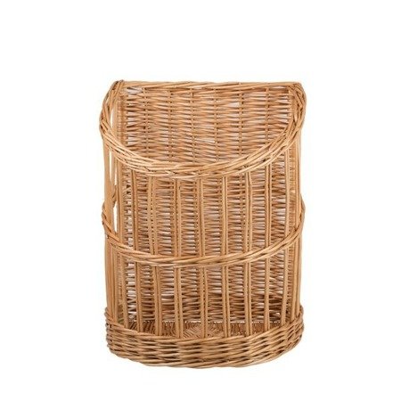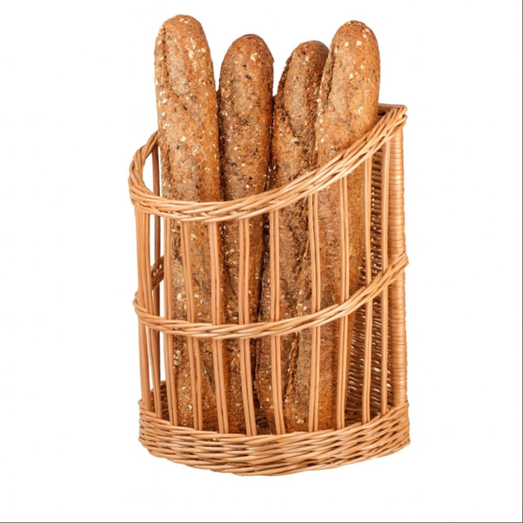 Zgrabny, wysoki kosz wiklinowy na bagietki wyróżnia się półotwartą, stopniowaną linią frontu i pełnym, gęsto plecionym tyłem, który stabilizuje pieczywo. Spiralne obręcze wzmacniają konstrukcję i ułatwiają odkładanie pieczywa, a solidny rant dna oraz starannie wykończone krawędzie dodają elegancji i lekkości. Naturalny odcień wikliny harmonijnie komponuje się z każdą aranżacją kuchni lub witryny.
