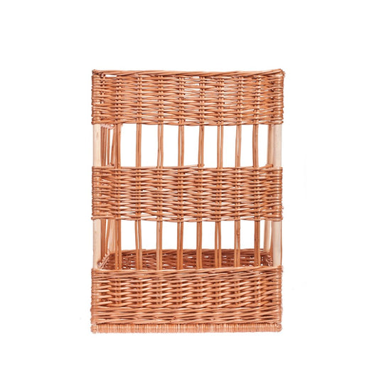 Ten wolnostojący stojak na bagietki z naturalnej wikliny ma wysoką, prostokątną formę i ażurowe ścianki. Gęstszy splot wzmacnia dół i środkową część, tworząc estetyczne pasy. Pionowe pręty stabilizują całość, a solidne dno utrzymuje pieczywo w pionie, gotowe do podania.