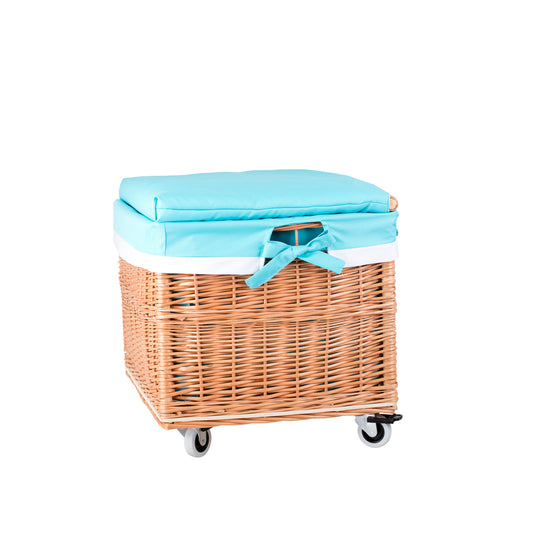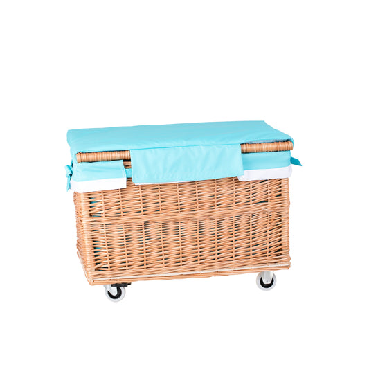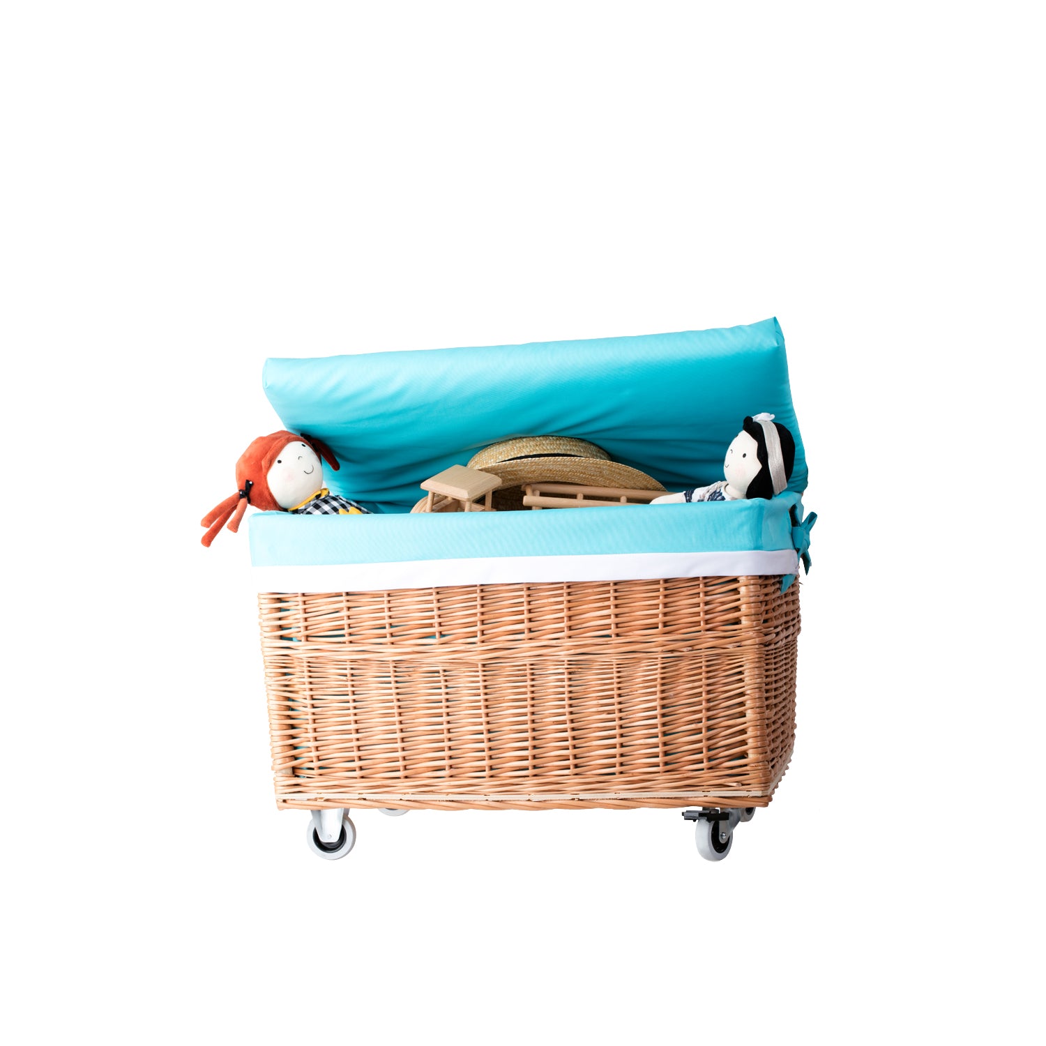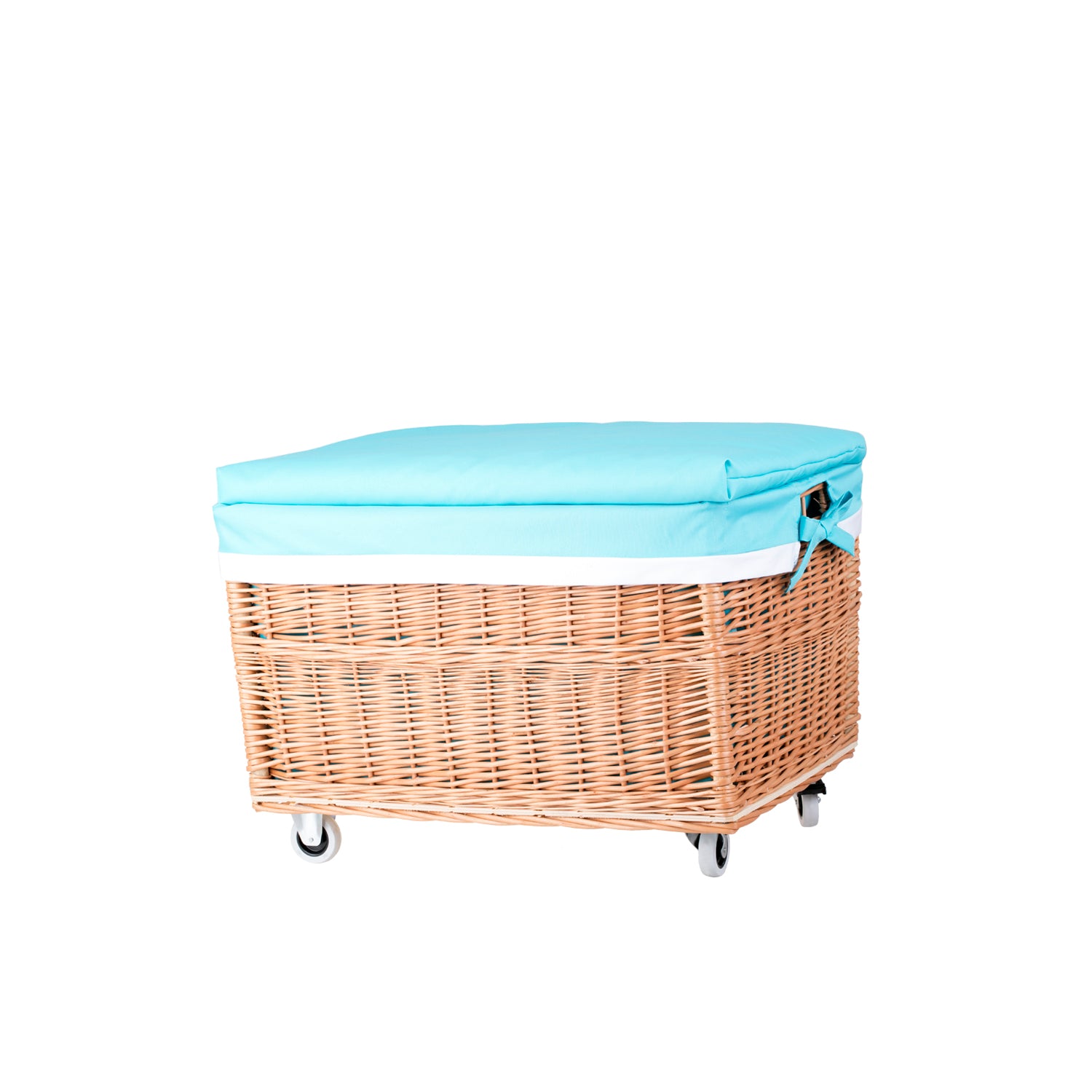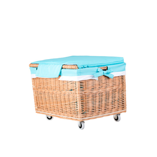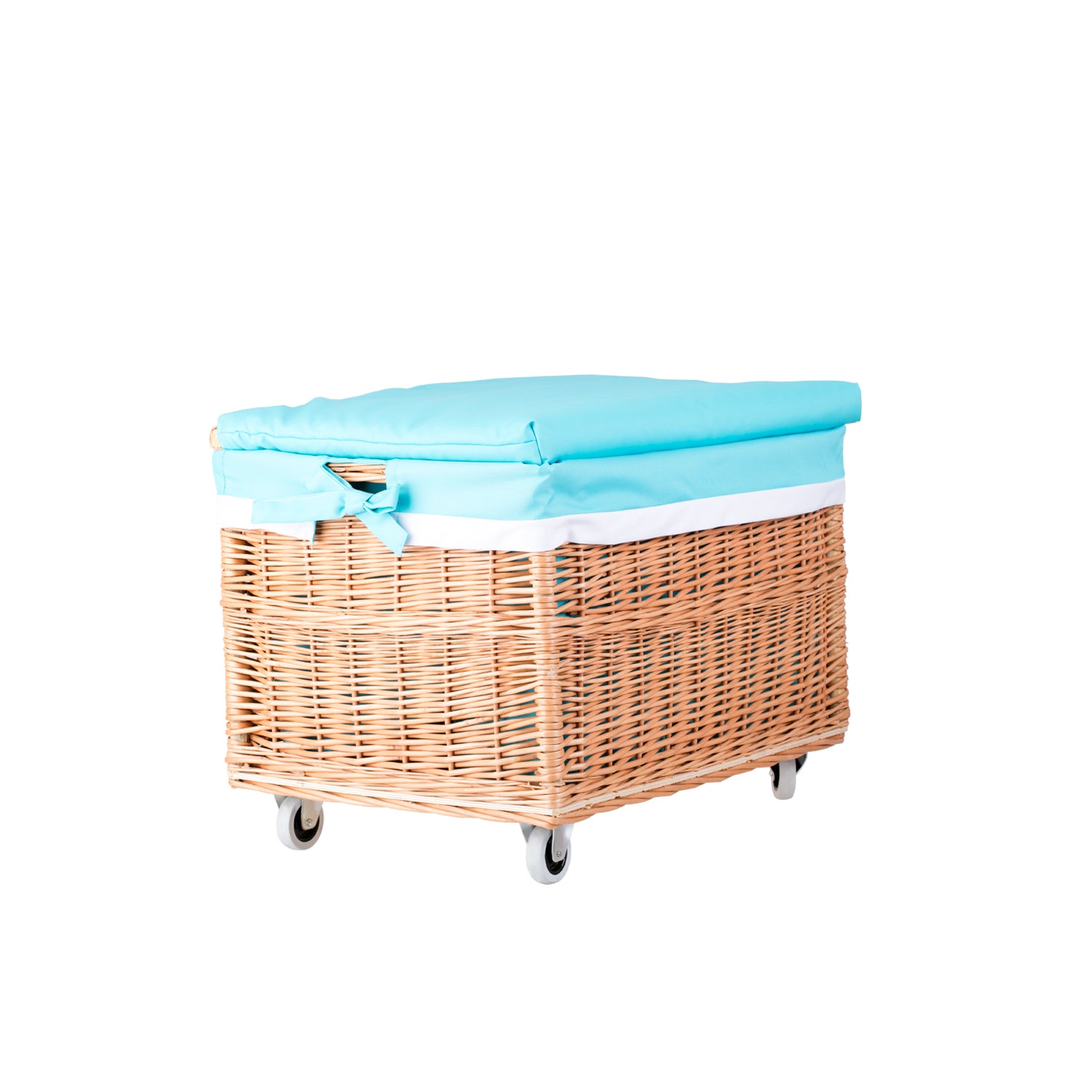 Cervus wiklinowy kosz z niebieskim obszyciem i kółkami TheWickerStories