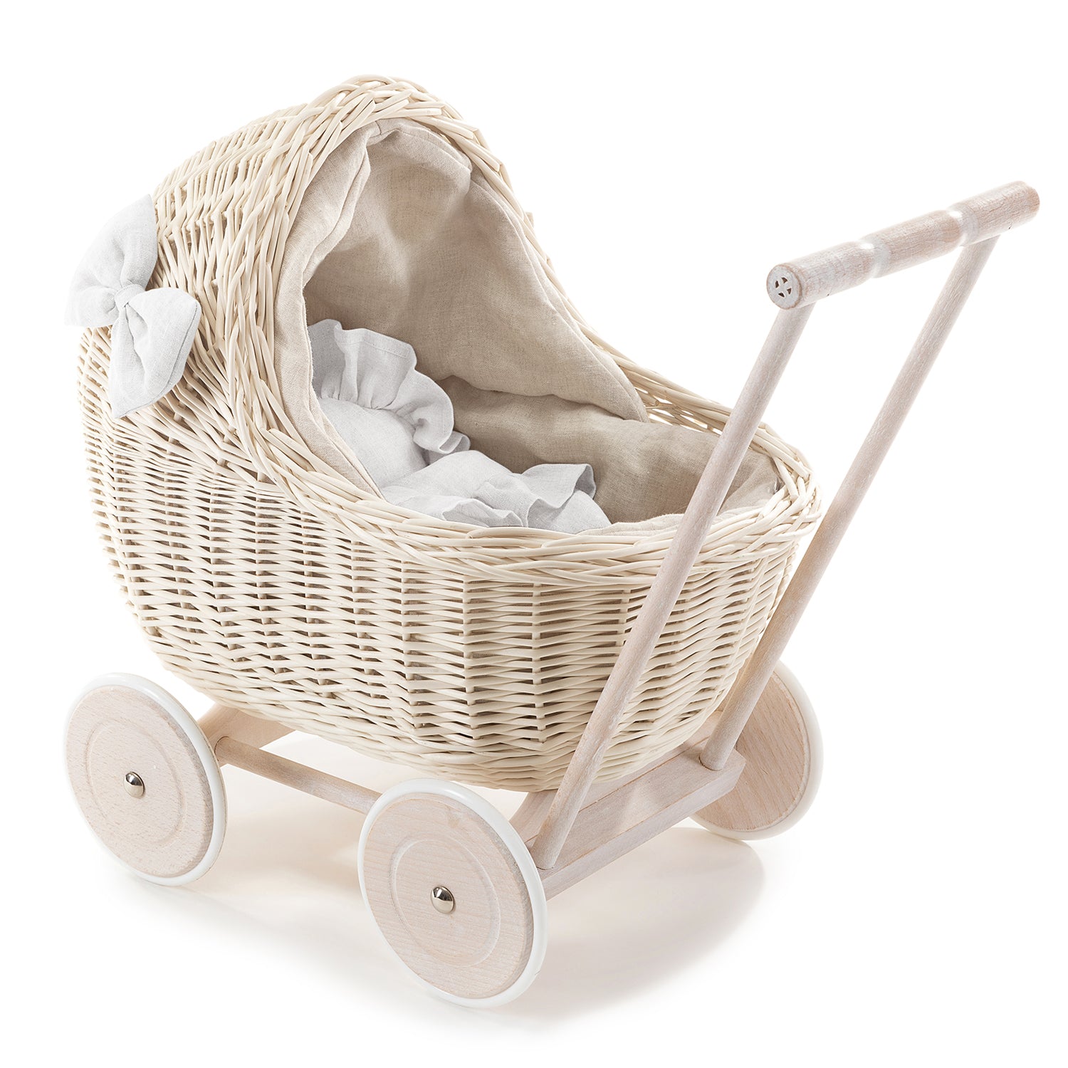 Desayer wiklinowy wózek dla lalek z beżowym lnianym obszyciem, z rączką, kołderką i poduszką TheWickerStories