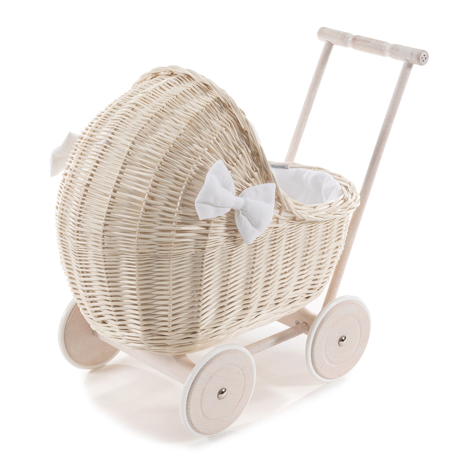 Specyfikacja Twojego Desayer wiklinowy wózek dla lalek z beżowym lnianym obszyciem, z rączką, kołderką i poduszką TheWickerStories