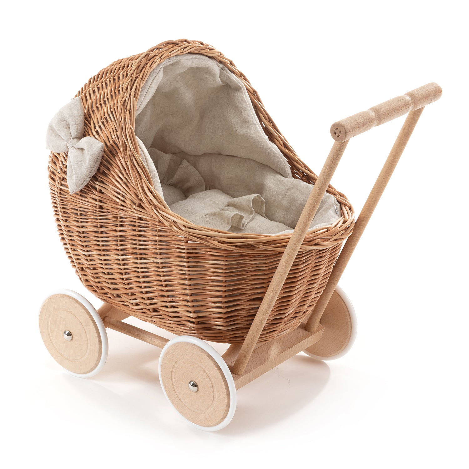 Desayer wiklinowy wózek dla lalek z beżowym obszyciem, z rączką, poduszką i kołderką TheWickerStories