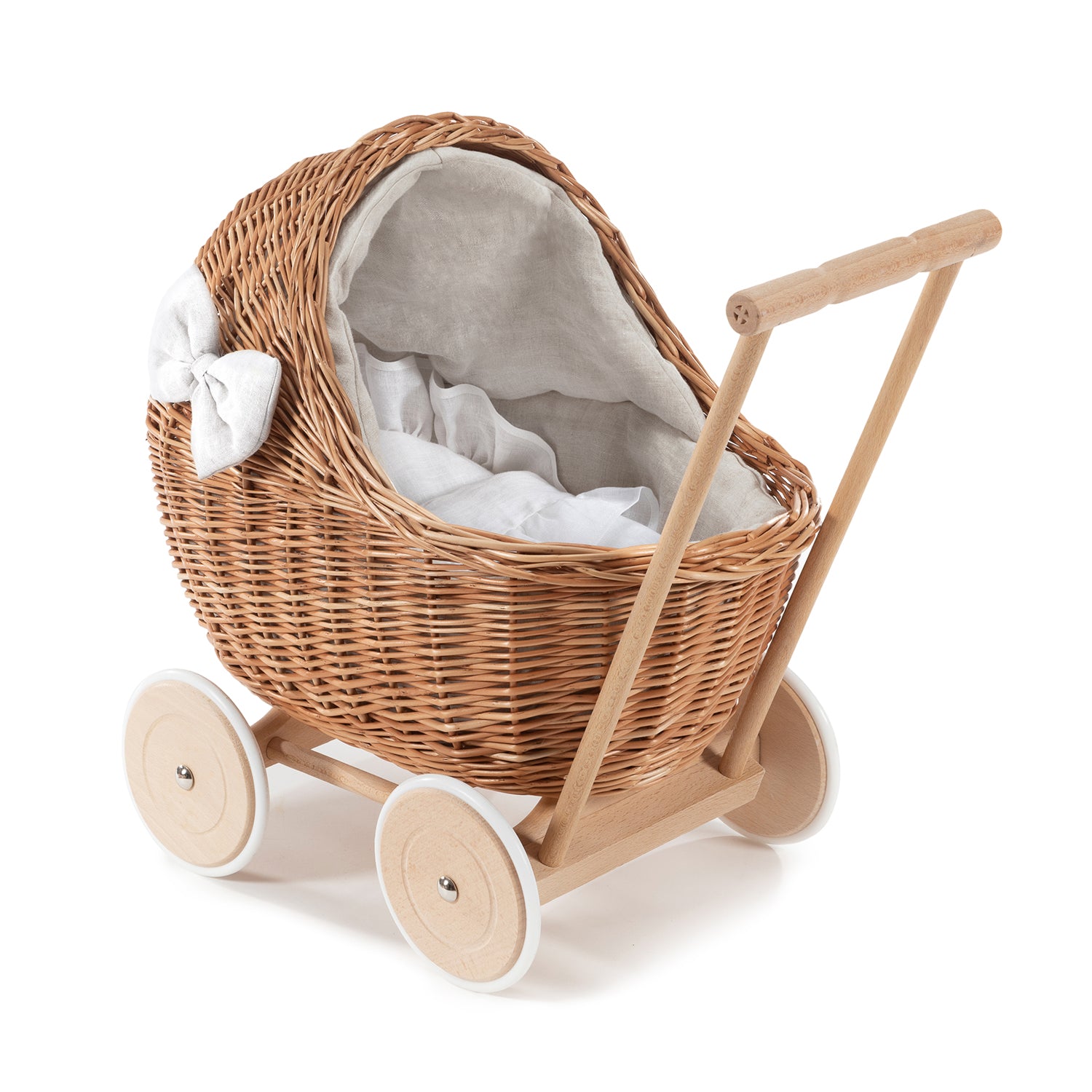 Desayer wiklinowy wózek dla lalek z białym obszyciem, kołderką i poduszką TheWickerStories