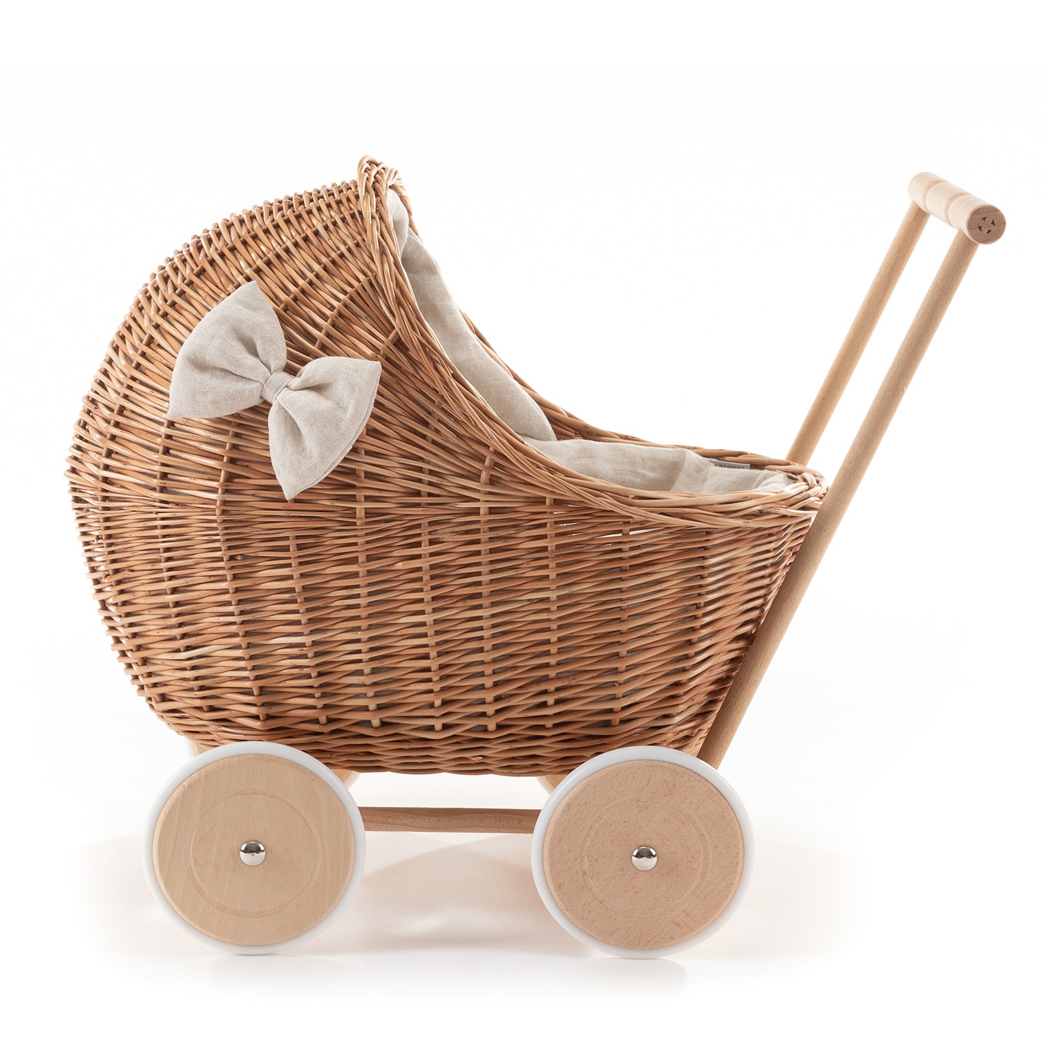 Wiklinowy wózek dla lalek zachwyca naturalnym odcieniem plecionki i dopracowanym, równym splotem. Wnętrze wyściełano miękkim, białym lnem, który tworzy przytulne gniazdko dla ulubionej lalki lub misia. W komplecie jest dopasowana lniana poduszka i kołderka z subtelną falbanką. Całość oparto na drewnianym stelażu z wygodną rączką i czterema kołami.