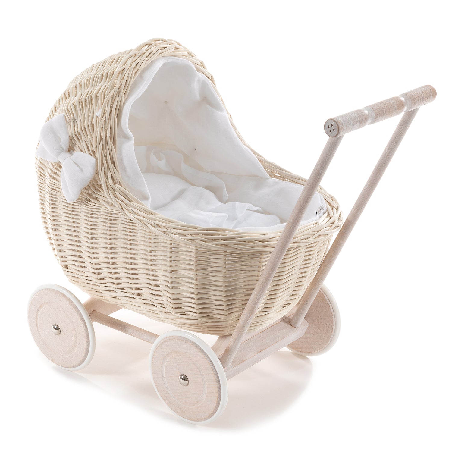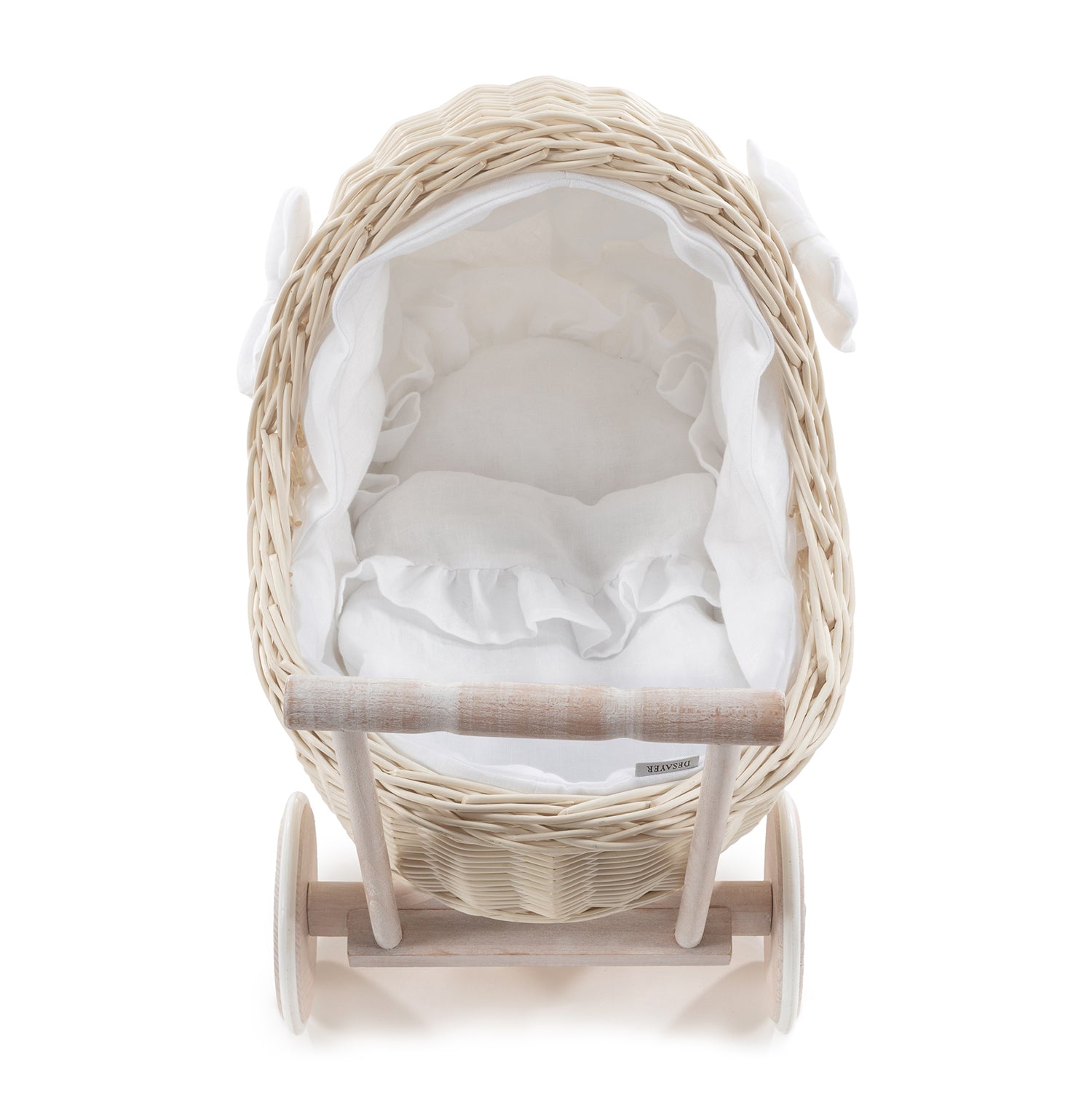 Desayer wiklinowy wózek dla lalek z białym obszyciem, kołderką i poduszką, z rączką TheWickerStories