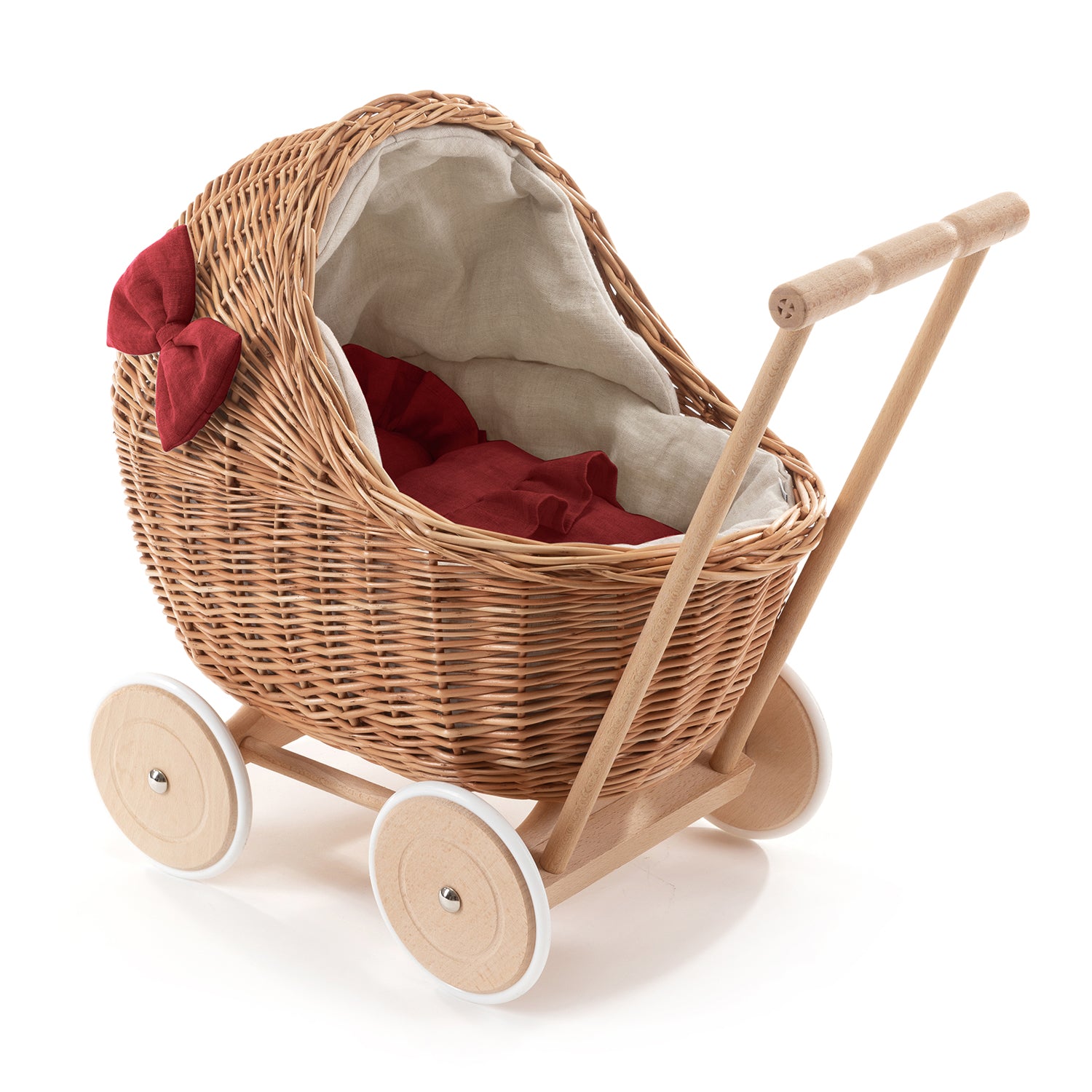 Desayer wiklinowy wózek dla lalek z czerwonym obszyciem, kołderką i poduszką TheWickerStories