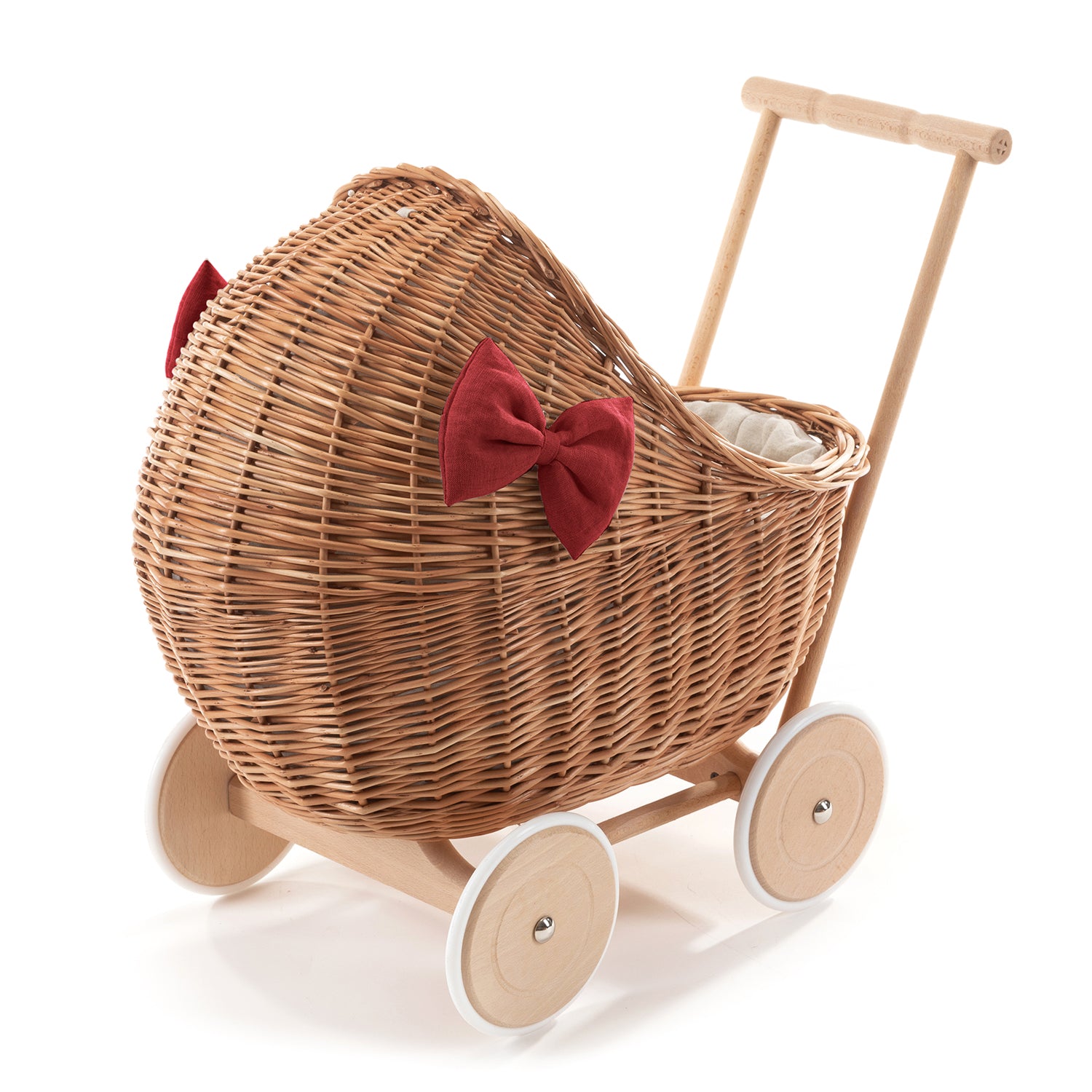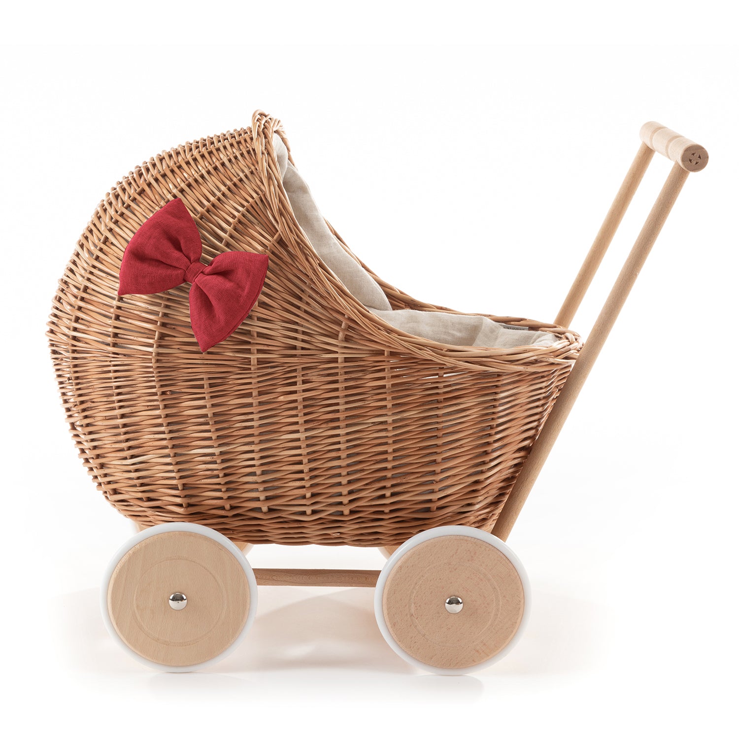 Wybierz ekologiczny, ręcznie pleciony wózek dla lalek z czerwonym obszyciem – piękny, trwały i gotowy, by podarować dziecku godziny radosnej zabawy.