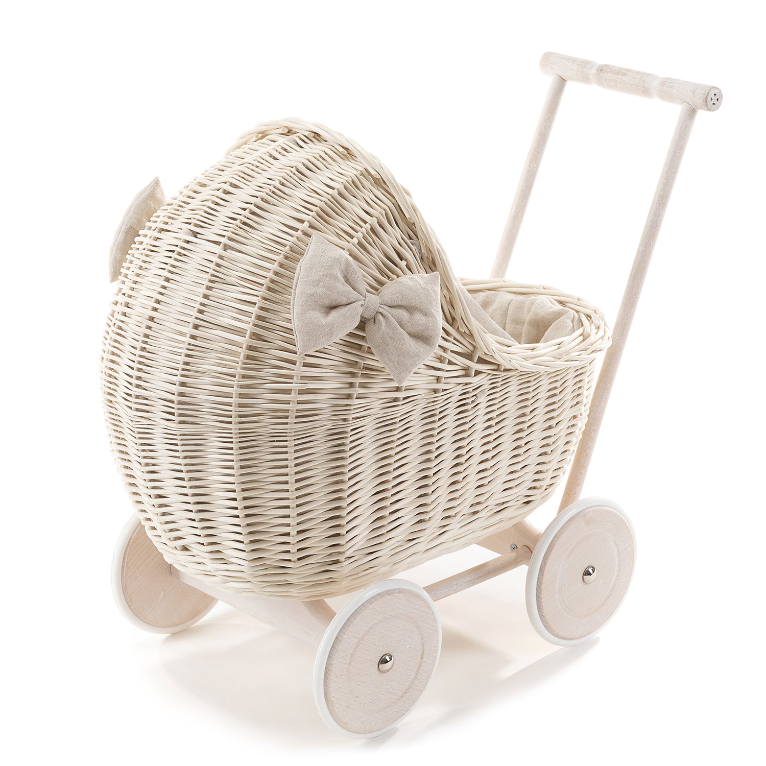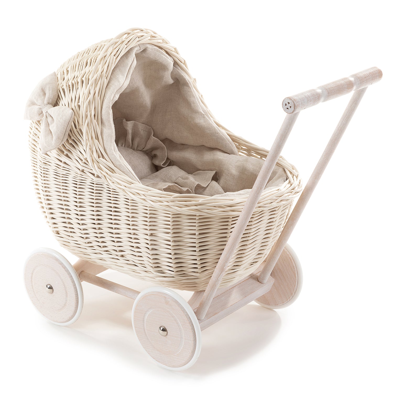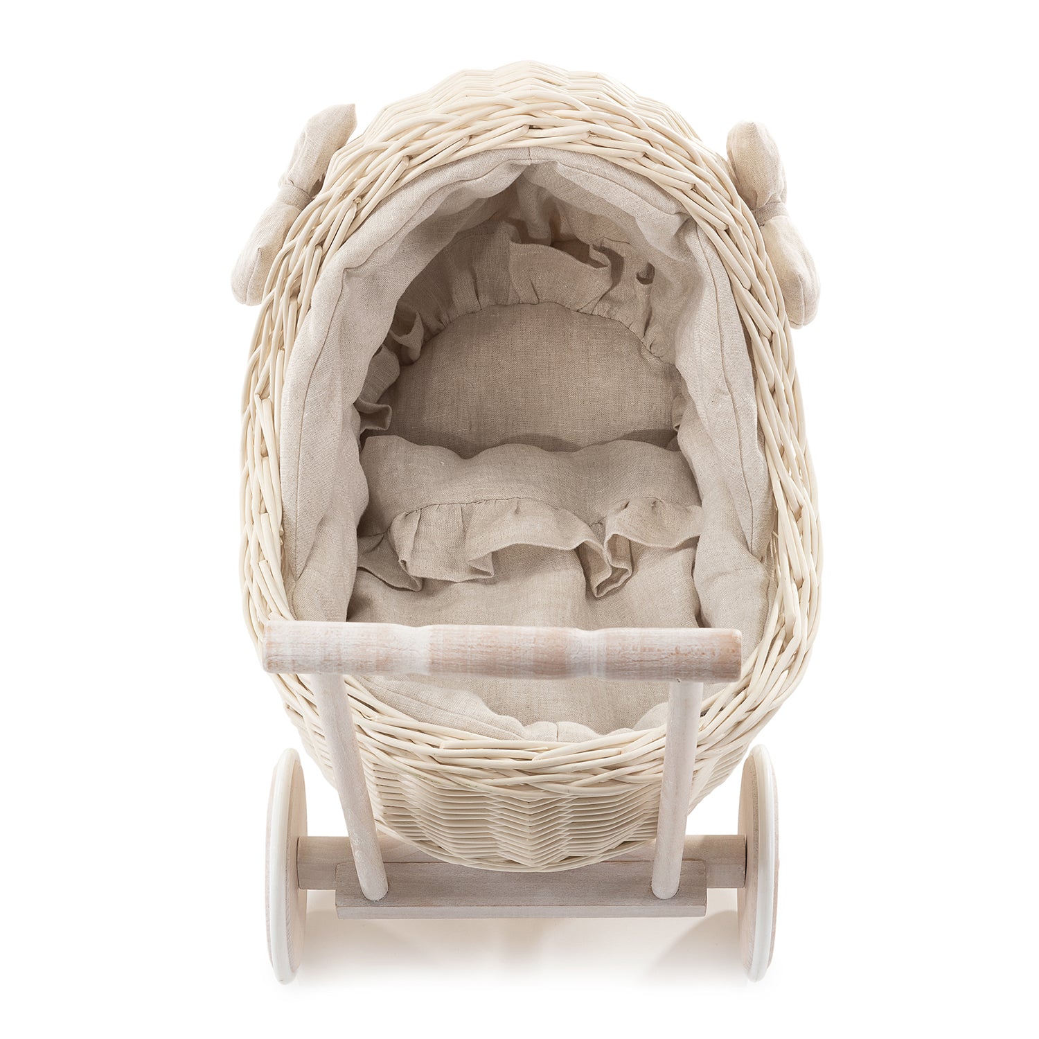 Desayer wiklinowy wózek dla lalek z kremowym obszyciem, kołderką i poduszką TheWickerStories