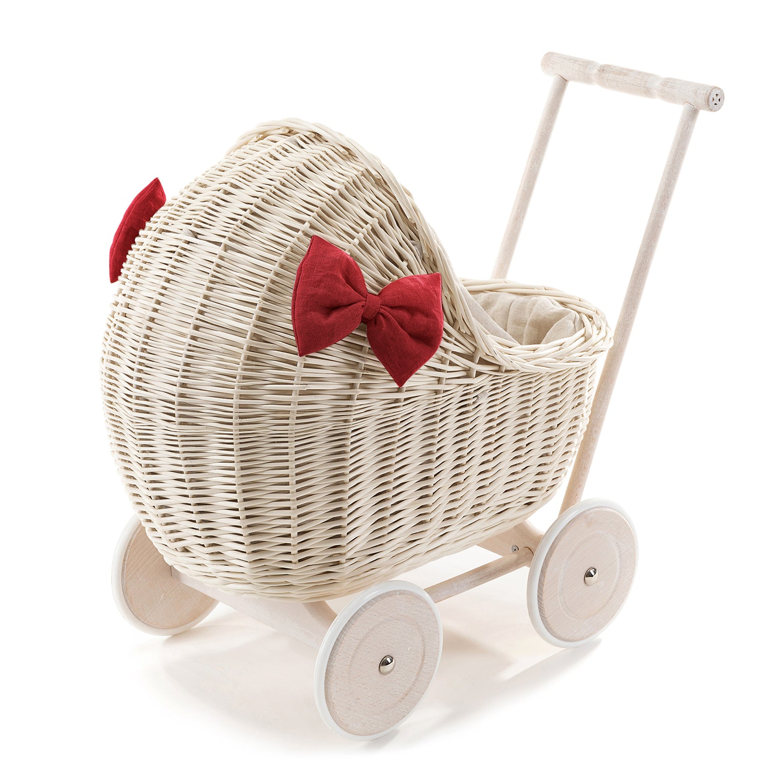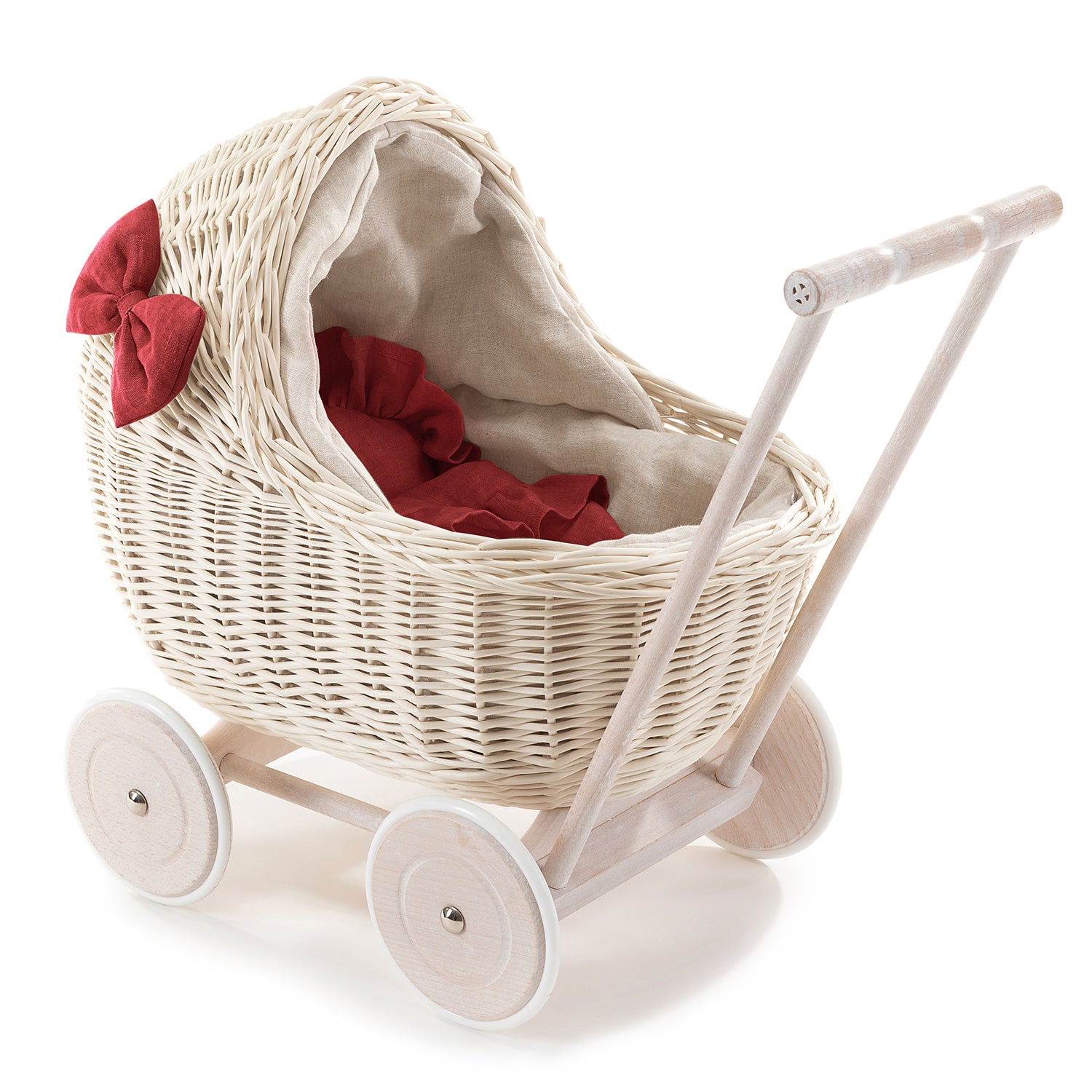 Desayer wiklinowy wózek dla lalek z lnianym obszyciem i czerwoną pościelą, z rączką, kołderką i poduszką TheWickerStories