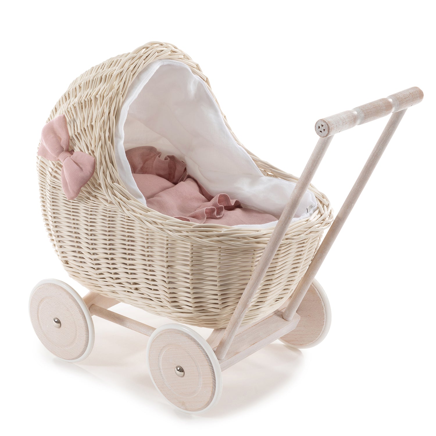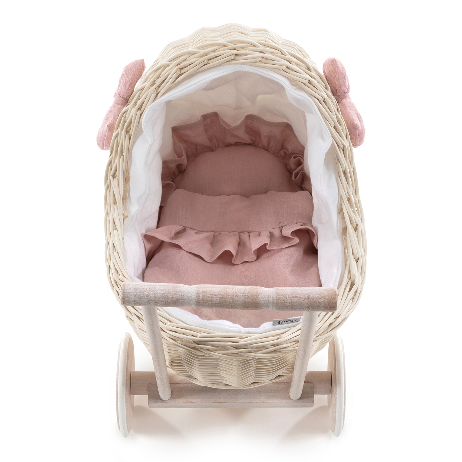 Desayer wiklinowy wózek dla lalek z lnianym obszyciem i różową pościelą, z kołderką, poduszką i rączką TheWickerStories