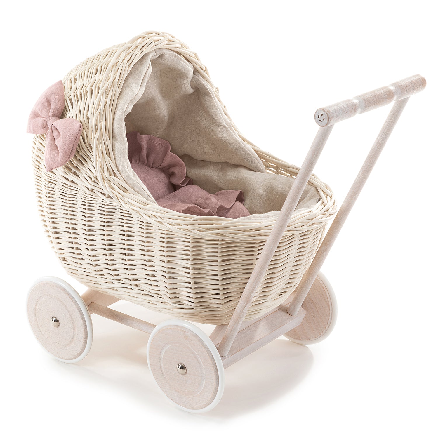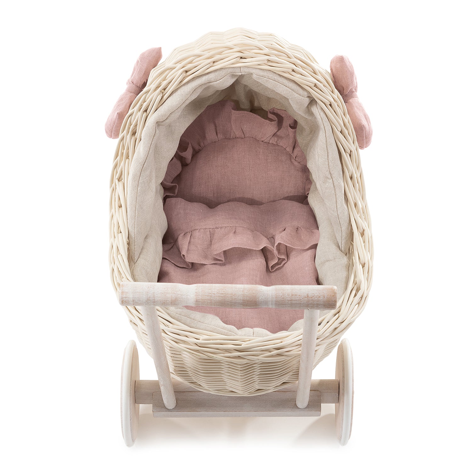 Desayer wiklinowy wózek dla lalek z różowym obszyciem, kołderką i poduszką, z rączką TheWickerStories