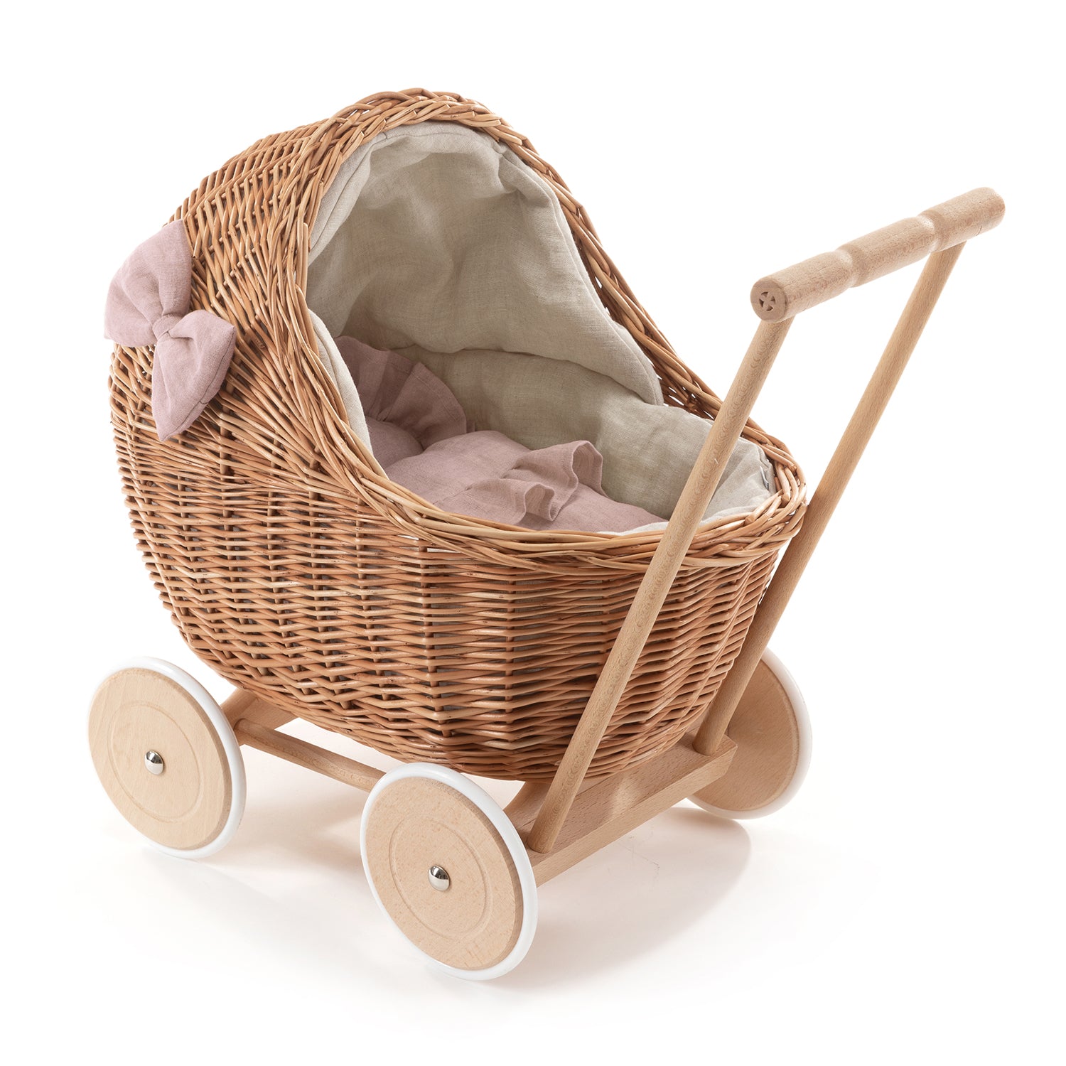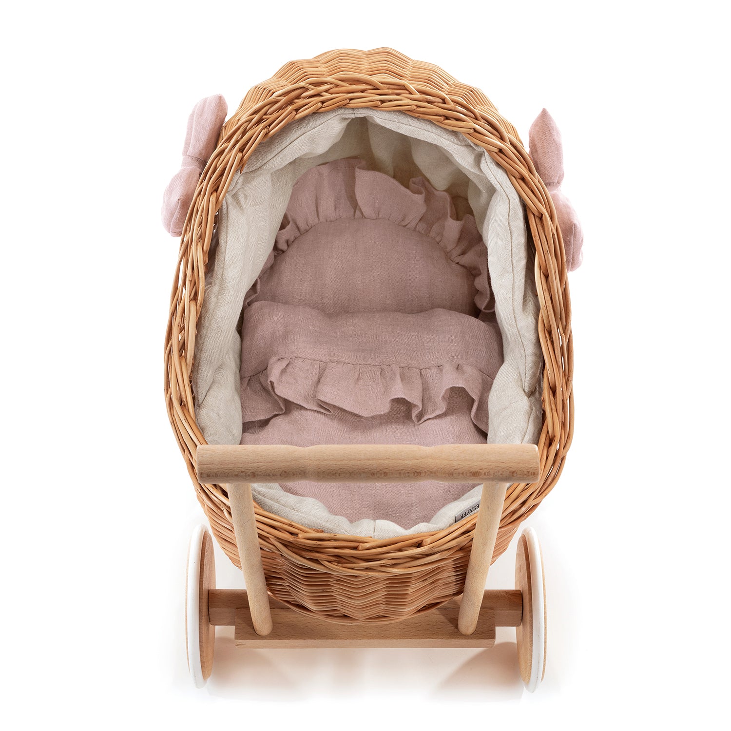 Desayer wiklinowy wózek dla lalek z różowym obszyciem, z rączką, poduszką i kołderką TheWickerStories
