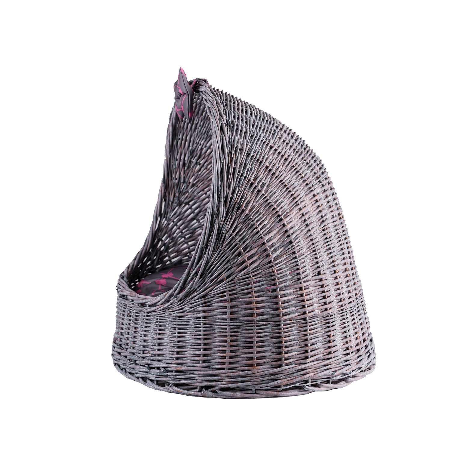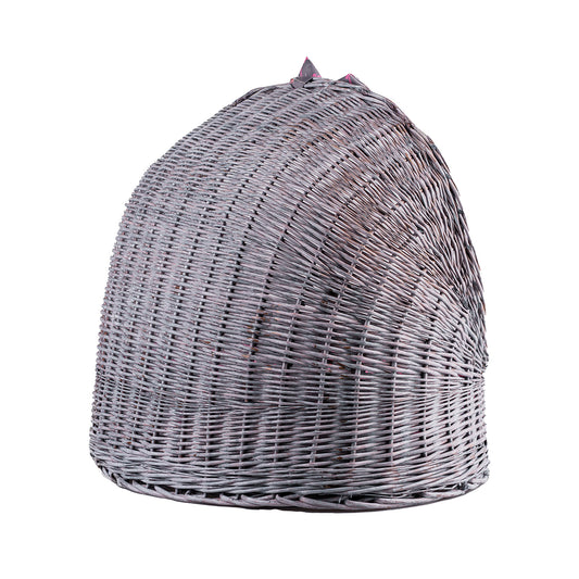 Elegancki domek wykonany z wikliny prezentuje się w szlachetnym, szarym odcieniu. Owalna bryła z delikatnie opadającym zadaszeniem tworzy przytulną niszę, a szerokie wejście ułatwia dostęp i wietrzenie wnętrza. Gęsty, równy splot podkreśla ręczne rzemiosło i zapewnia stabilność. Zaokrąglone krawędzie są miłe w dotyku, a w środku czeka miękka, wyjmowana poduszka.