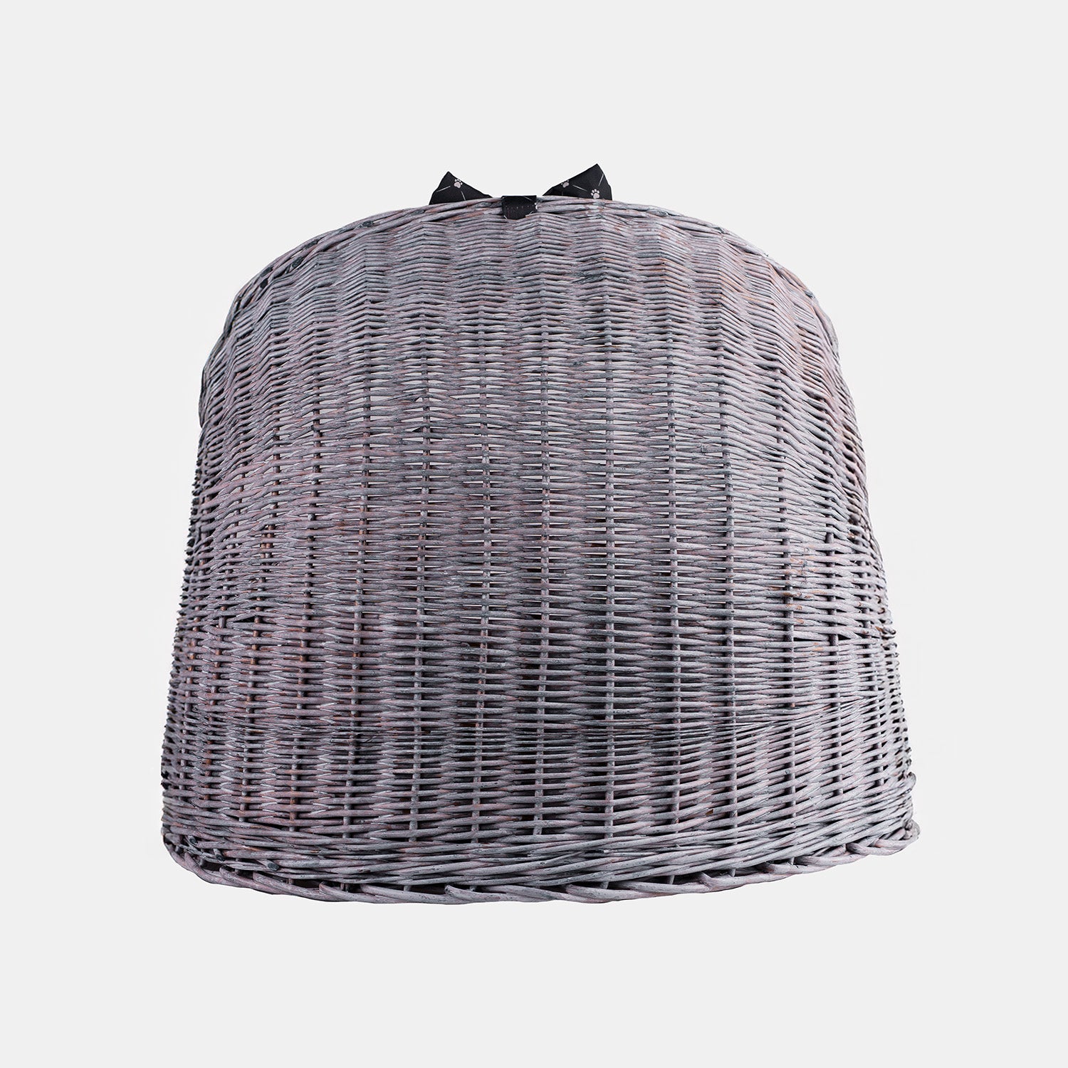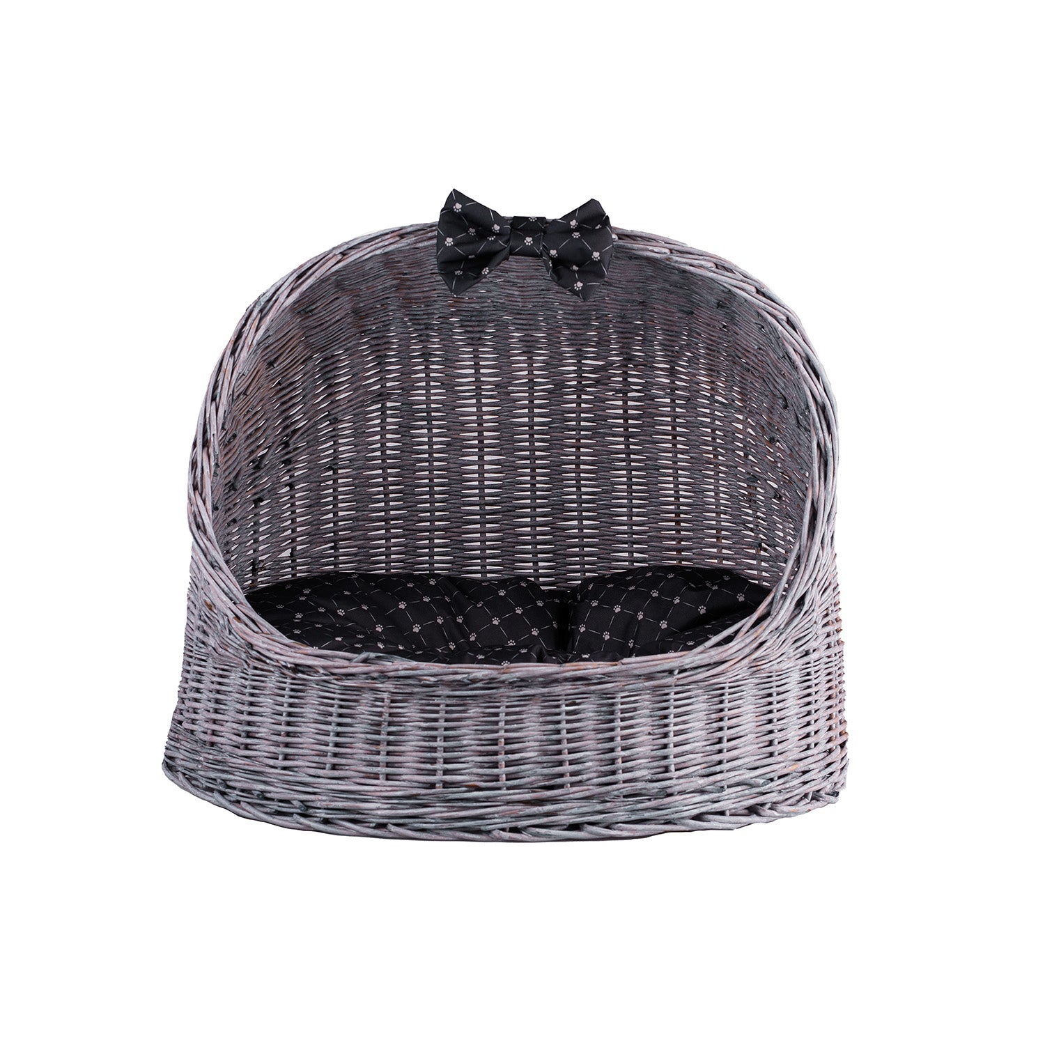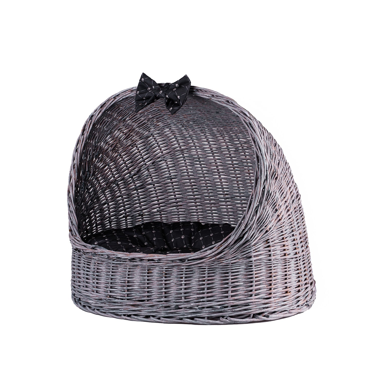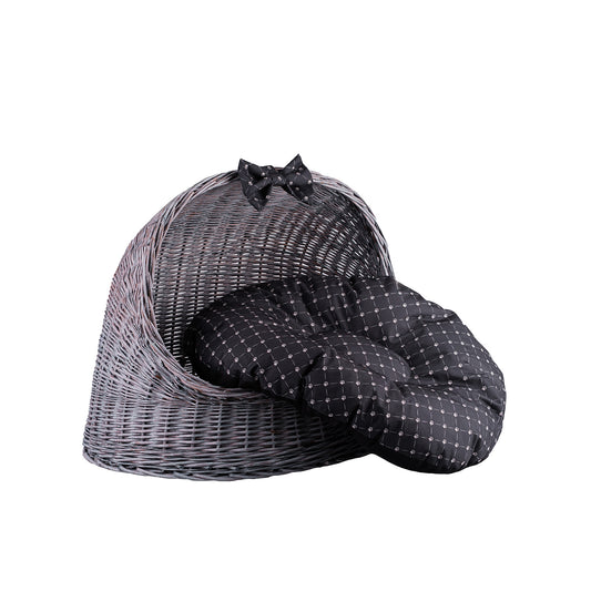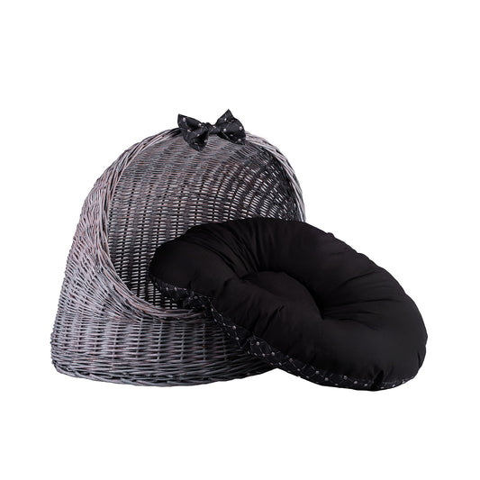 Stylowy wiklinowy domek w szaro‑czarnym odcieniu łączy estetykę z przytulnością. Owalny korpus z półkopułowym zadaszeniem tworzy osłonięte, zaciszne wejście, w którym pupil czuje się bezpiecznie i spokojnie. Splot jest gęsty i równy, krawędzie miękko wyoblone, a stabilna podstawa trzyma formę. W środku leży miękka, dopasowana poduszka, u góry zaś subtelna kokarda dodaje uroku. Każdy detal – od obwódki wejścia po wykończenie spodniej krawędzi – został starannie opracowany, by uniknąć ostrych zakończeń i zapewnić pełen komfort.