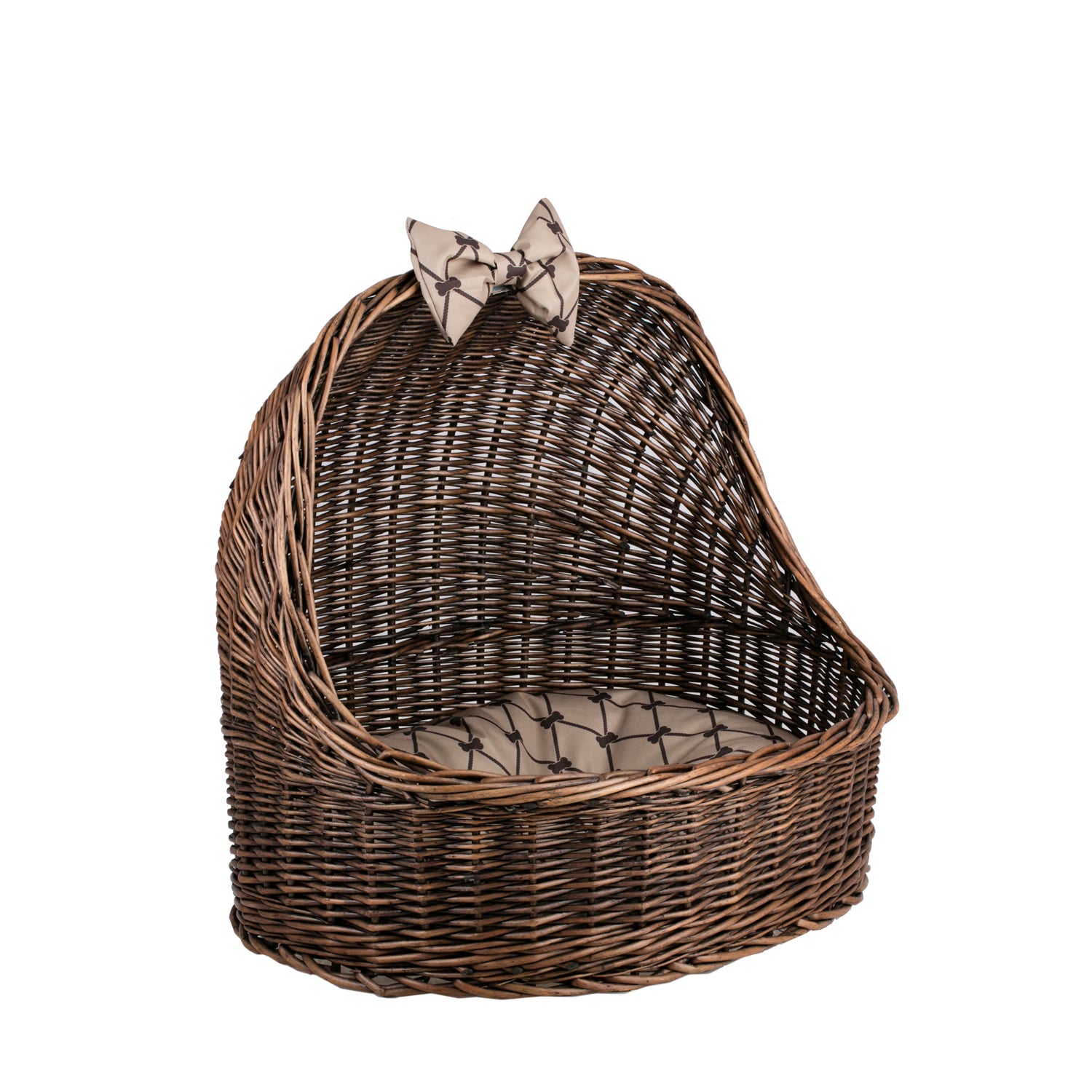 Elsa wiklinowy koszyk legowisko dla zwierząt z beżową poduszką i kokardą TheWickerStories