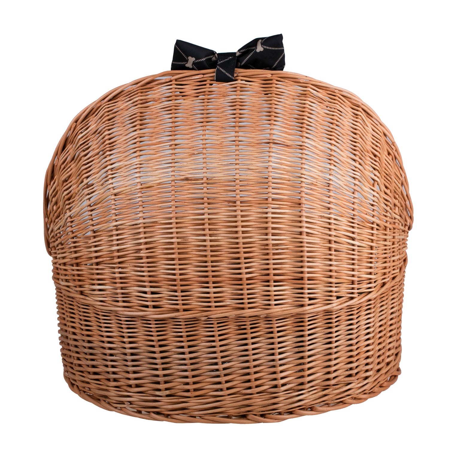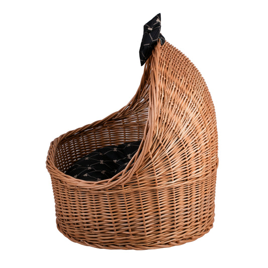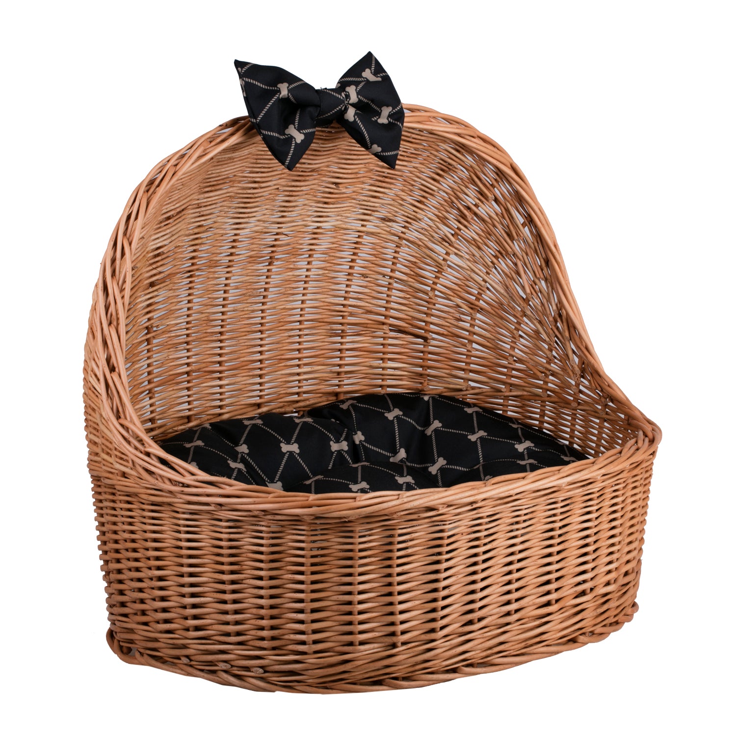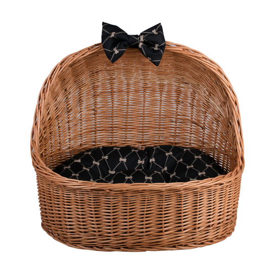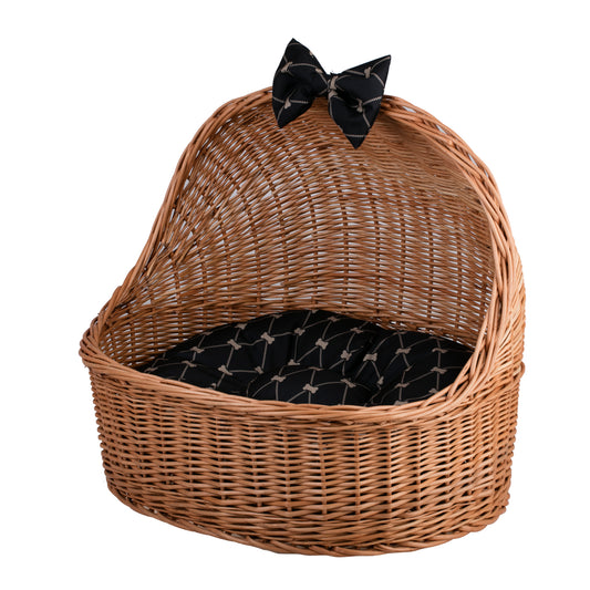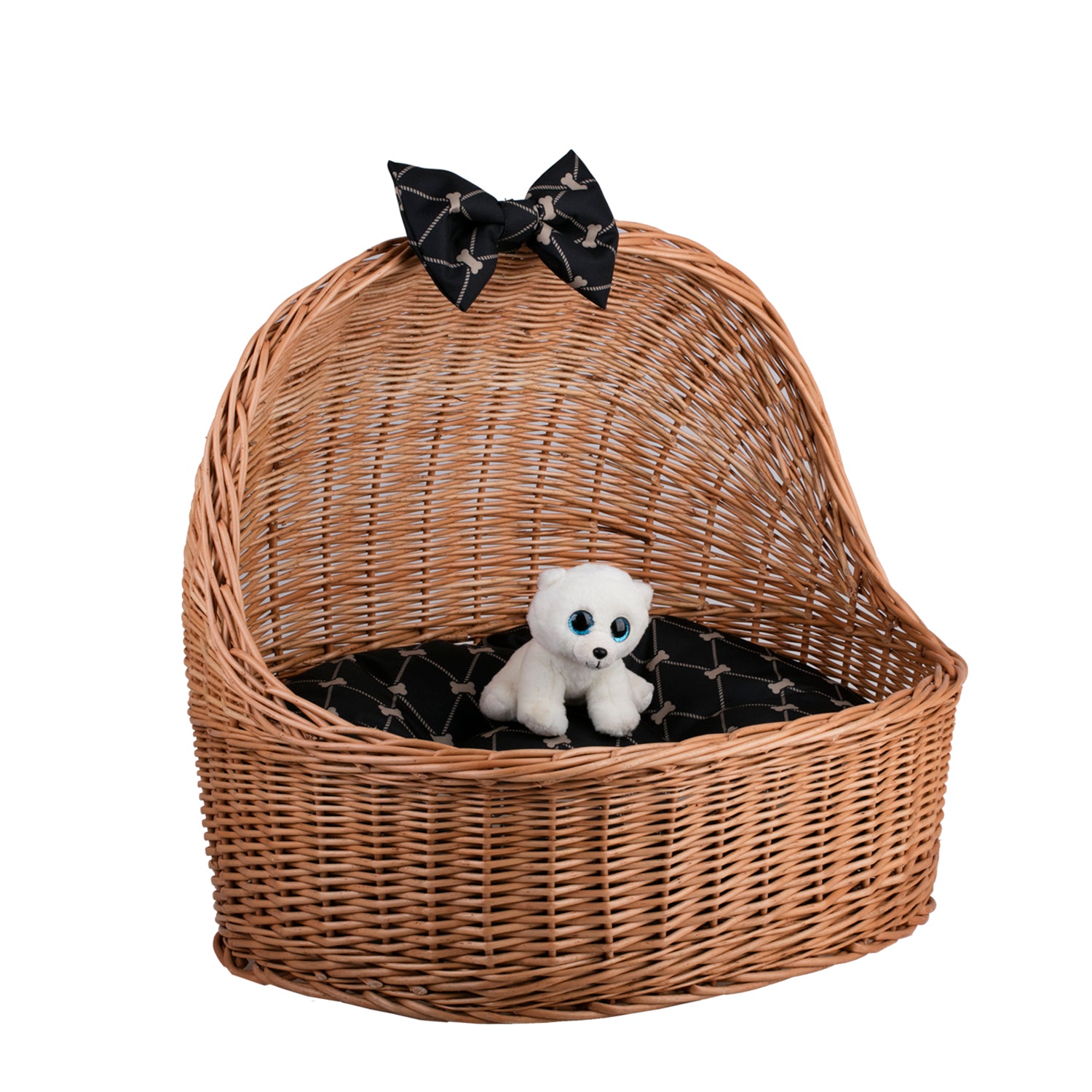 Elsa wiklinowy koszyk legowisko dla zwierząt z czarną poduszką i kokardą TheWickerStories