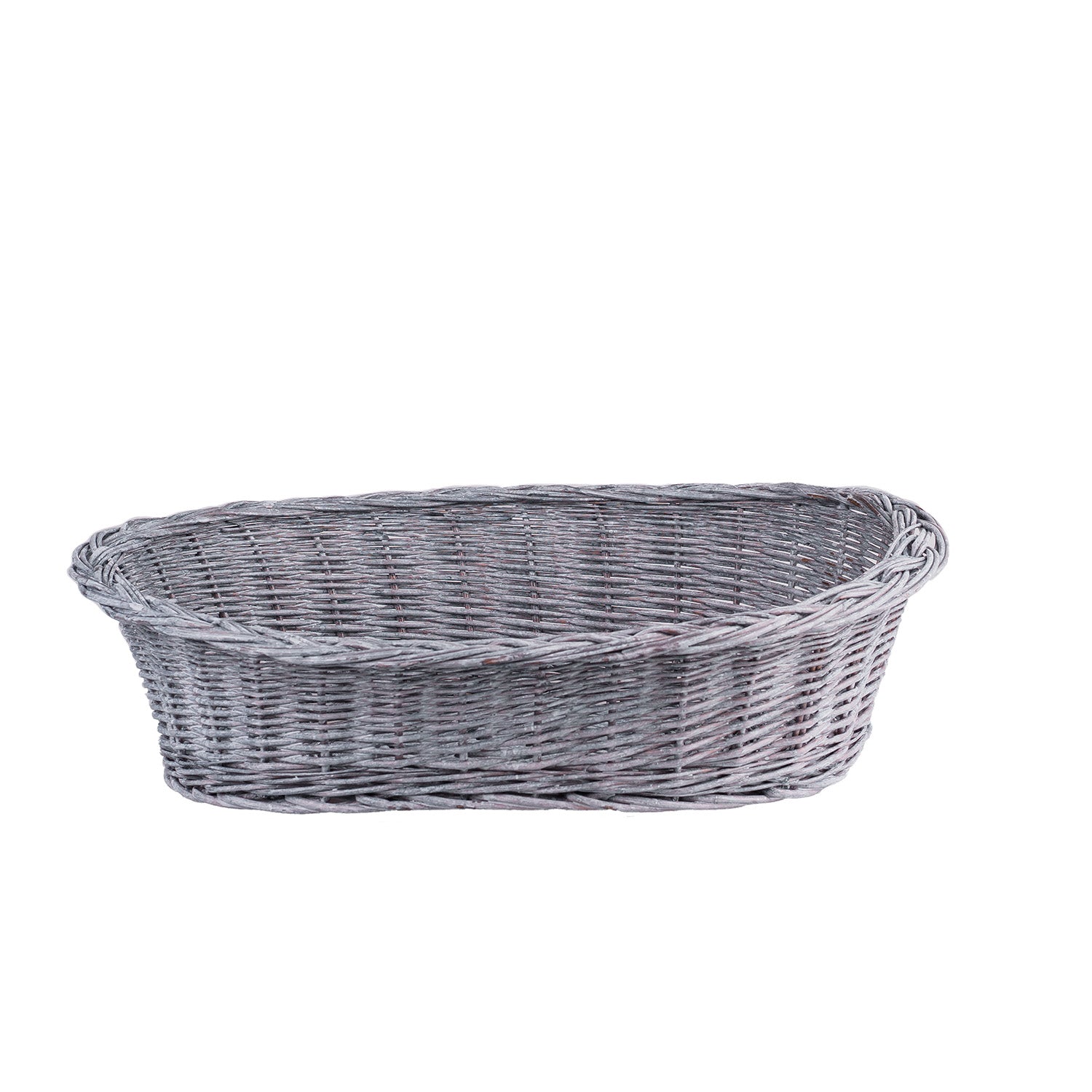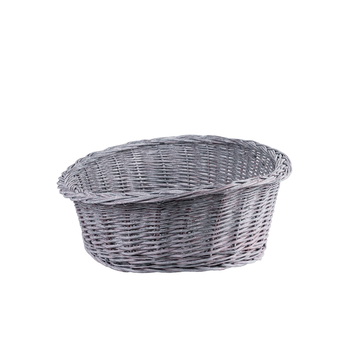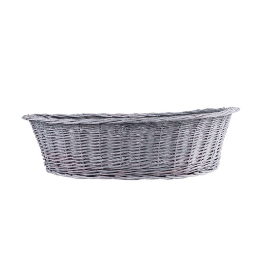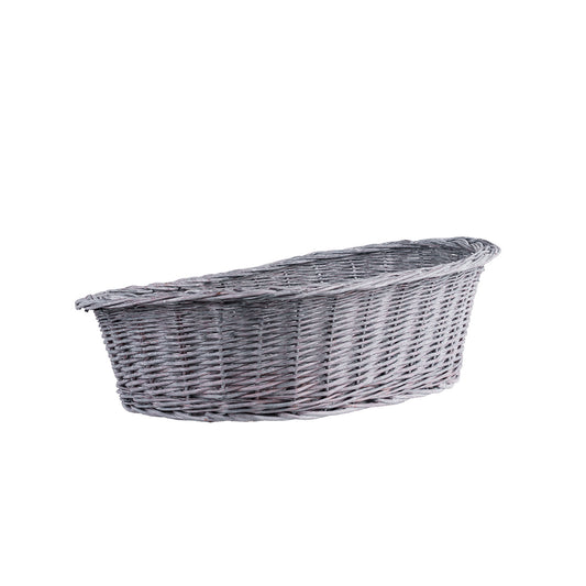 Eleganckie legowisko z wikliny malowanej na szaro ma prostą, ponadczasową formę. Korpus wykonano gęstym, równym splotem i zwieńczono solidnie wywiniętym rantem, który zwiększa stabilność oraz chroni krawędzie. Przód jest celowo niższy, ułatwiając zwierzakowi wejście i wygodne ułożenie.