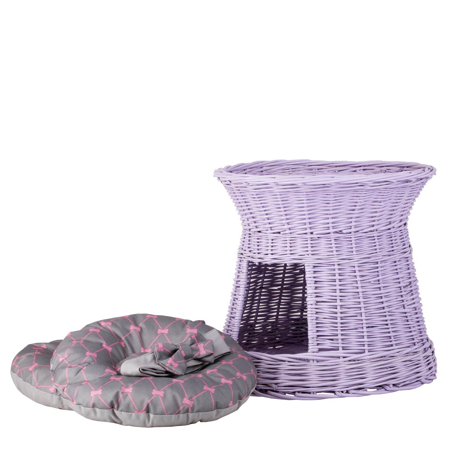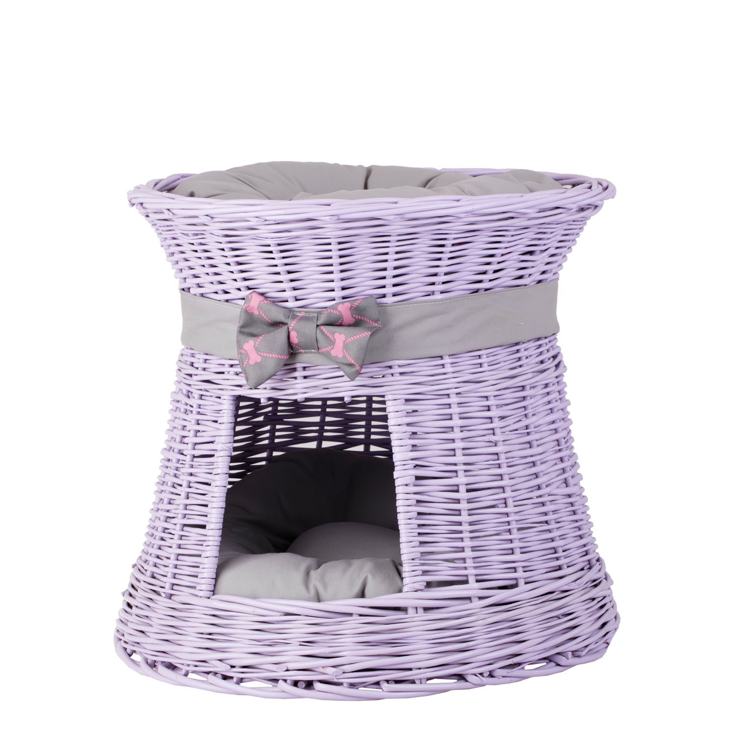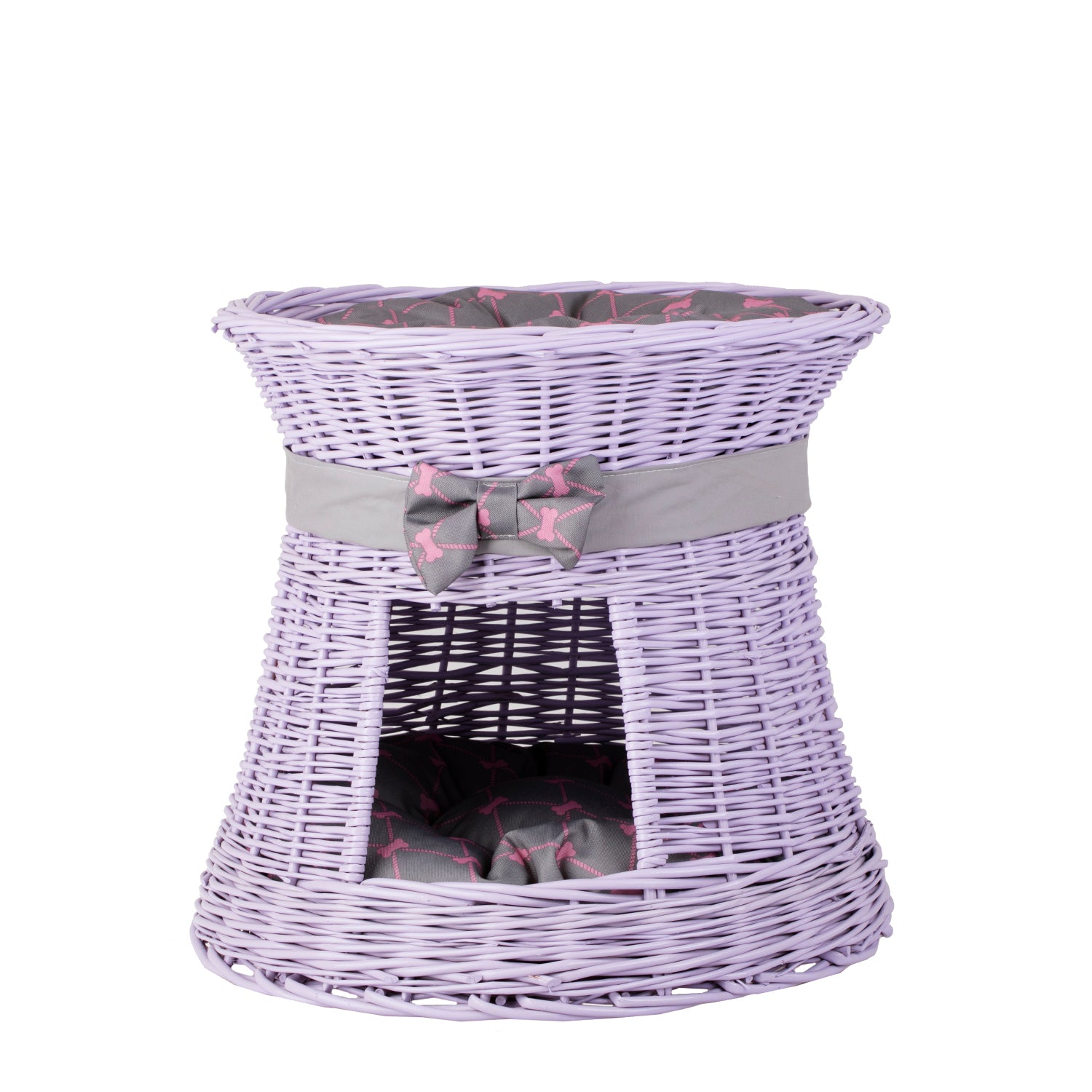 Ten wiklinowy domek dla kota i małego psa łączy przytulność z elegancją. Fioletowy, wiklinowy kosz tworzy dwupoziomowe schronienie: na dole norka, u góry legowisko. W komplecie dwie miękkie, szare poduszki i dekoracyjna opaska z kokardą w motyw kostek. Wejście jest szerokie, co ułatwia wchodzenie młodszym i starszym zwierzakom.