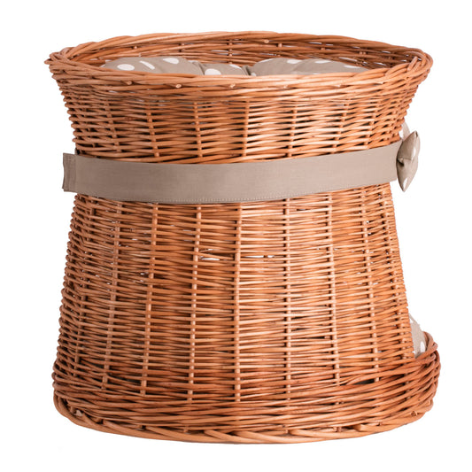 Eralis wiklinowy domek dla kota z beżowym obszyciem, dwupoziomowy, z poduszkami i kokardą TheWickerStories