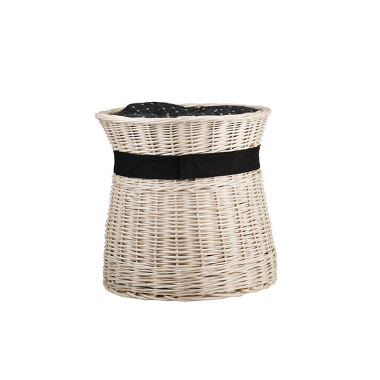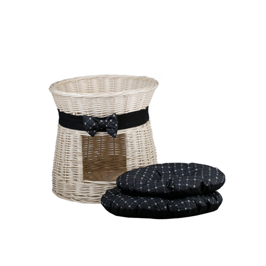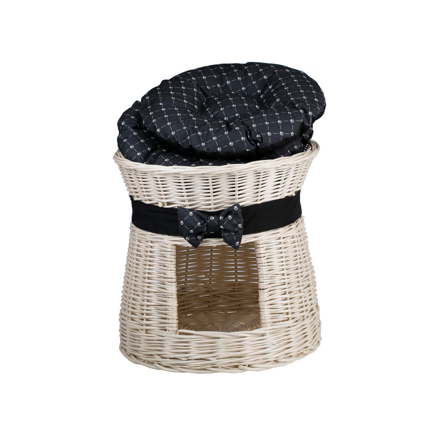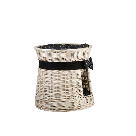 Okrągły wiklinowy domek dla kota łączy wygodę pupila z estetyką wnętrza. Kremowa wiklina tworzy równy, mocny splot z gładkim rantem, bez ostrych krawędzi. Na środku kosza znajduje się czarny pas materiałowy z dekoracyjną kokardą. Dolny otwór prowadzi do zacisznego legowiska, a górę wieńczy płaska platforma z miękką poduszką.