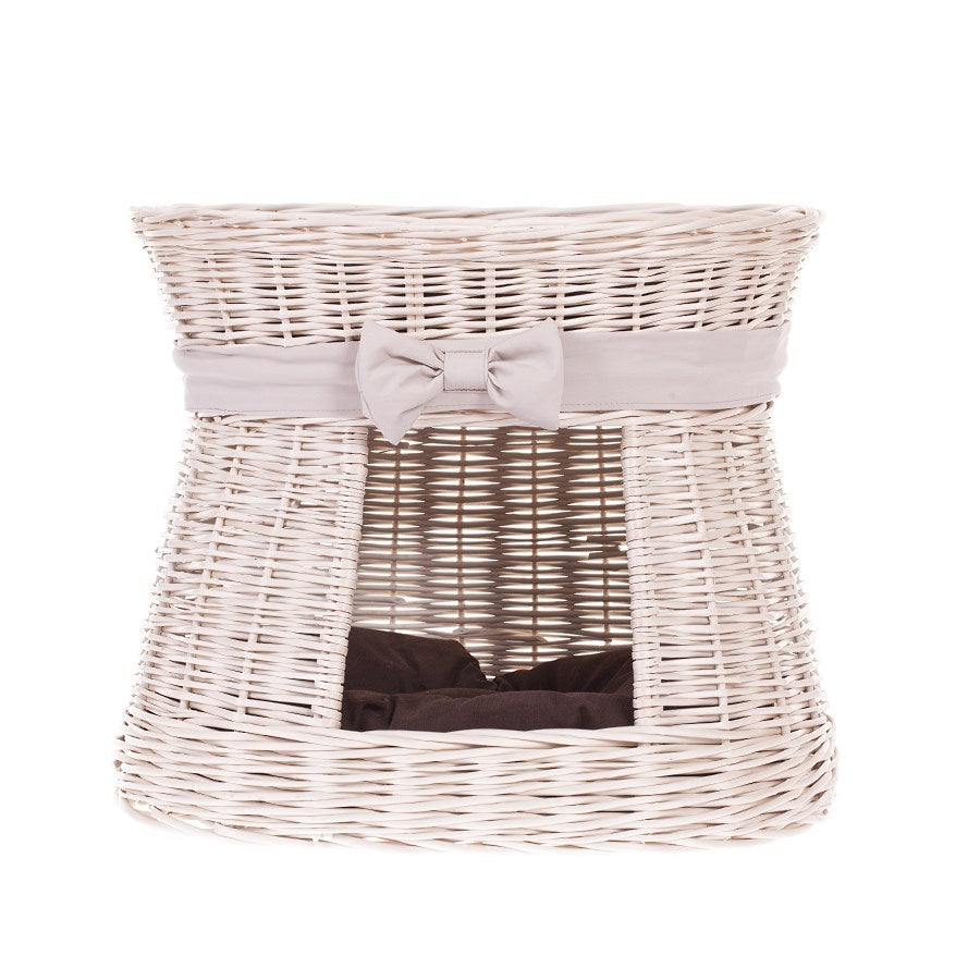 Erif wiklinowy domek dla kota dwupoziomowy z brązowymi poduszkami TheWickerStories