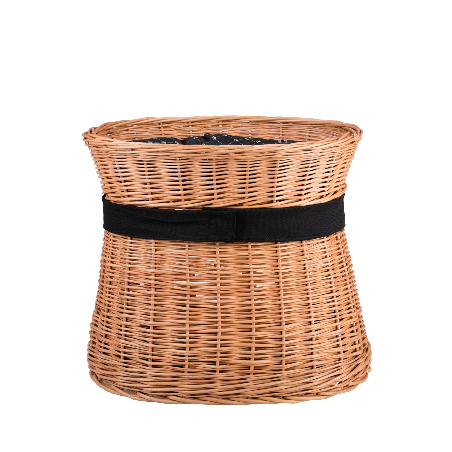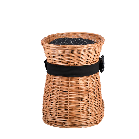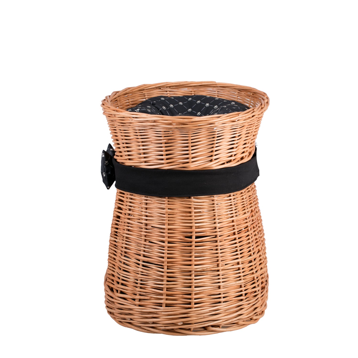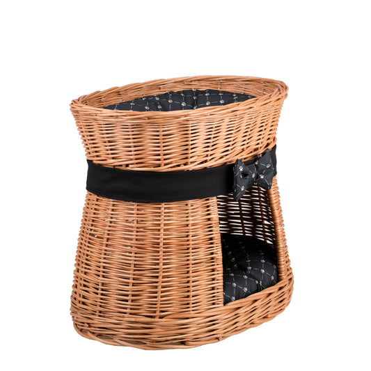 Erif wiklinowy domek dla kota dwupoziomowy z czarnymi poduszkami i kokardą TheWickerStories