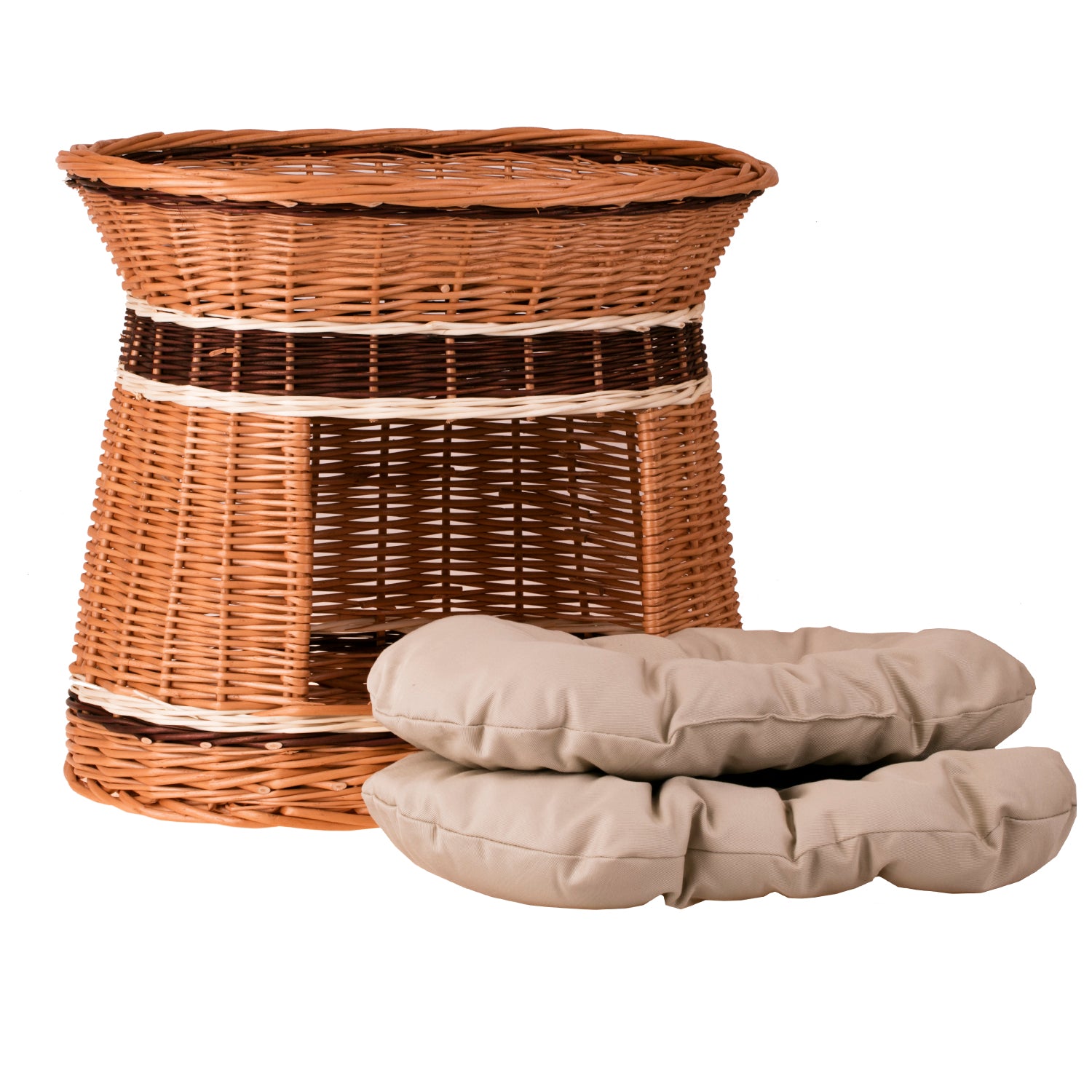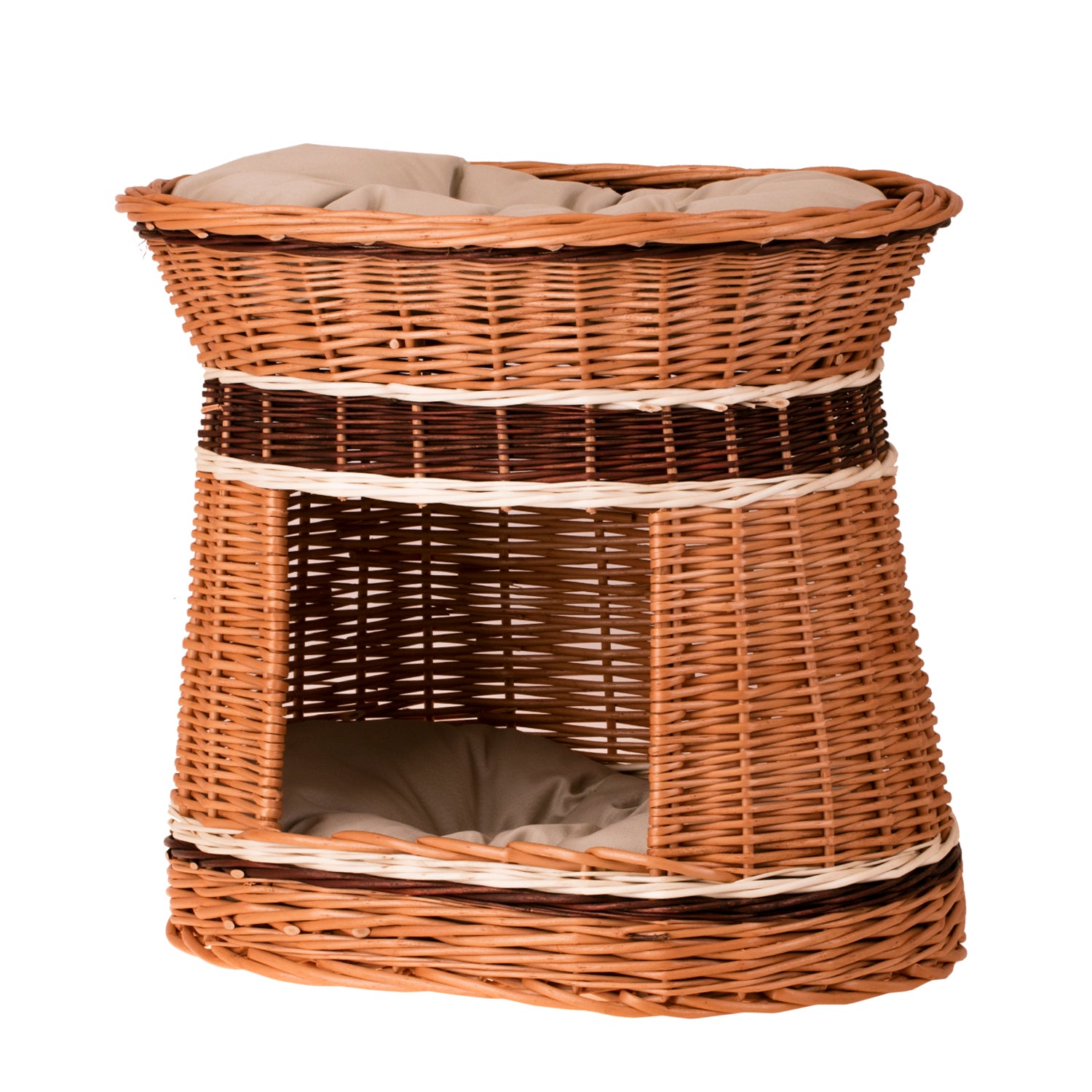 Erif wiklinowy domek dla kota i małego psa z dwoma poduszkami i legowiskiem na dachu TheWickerStories