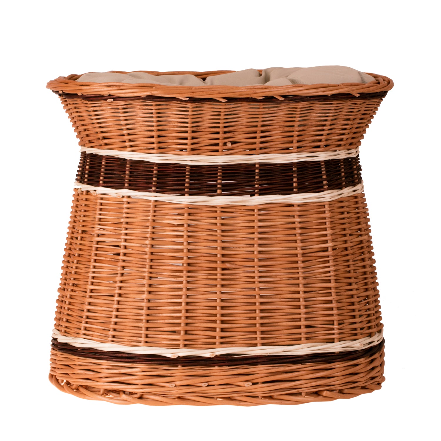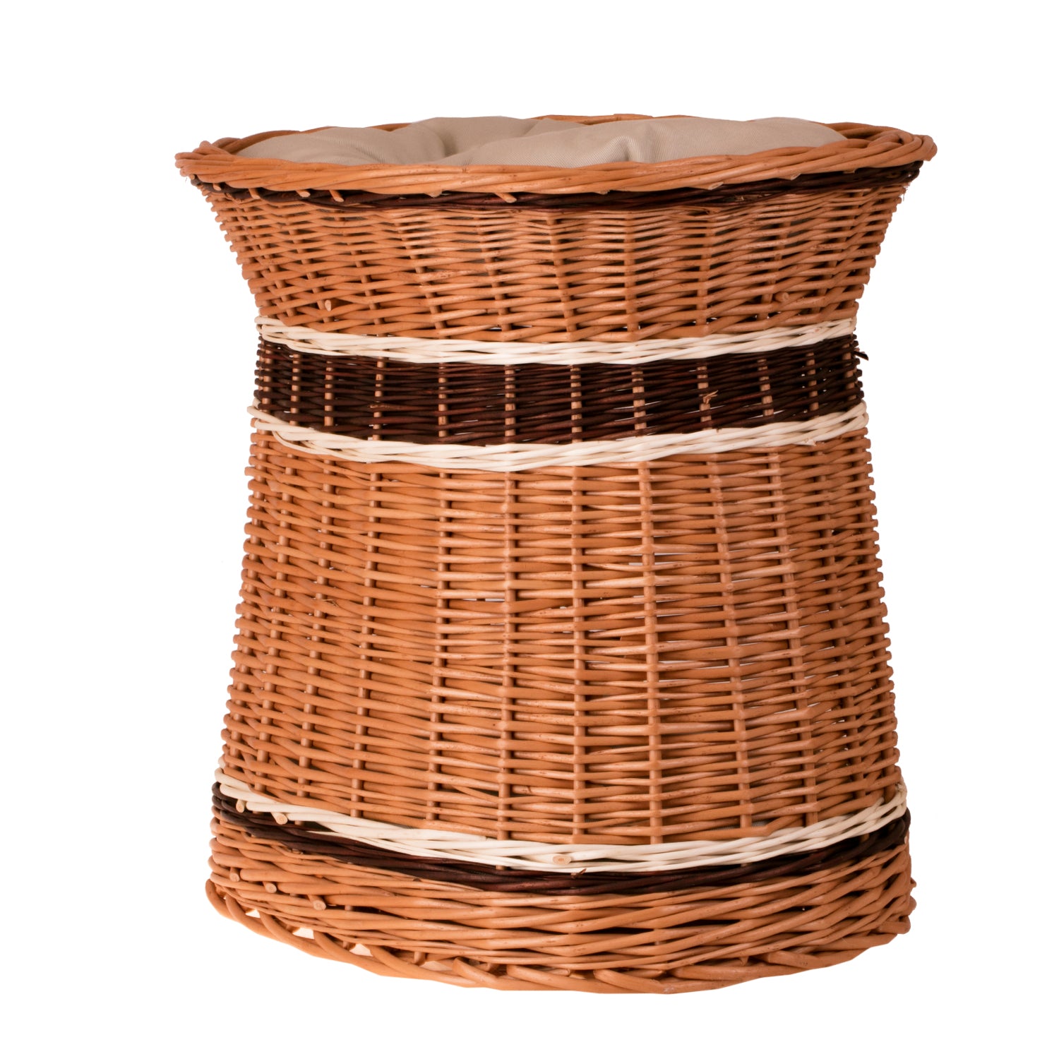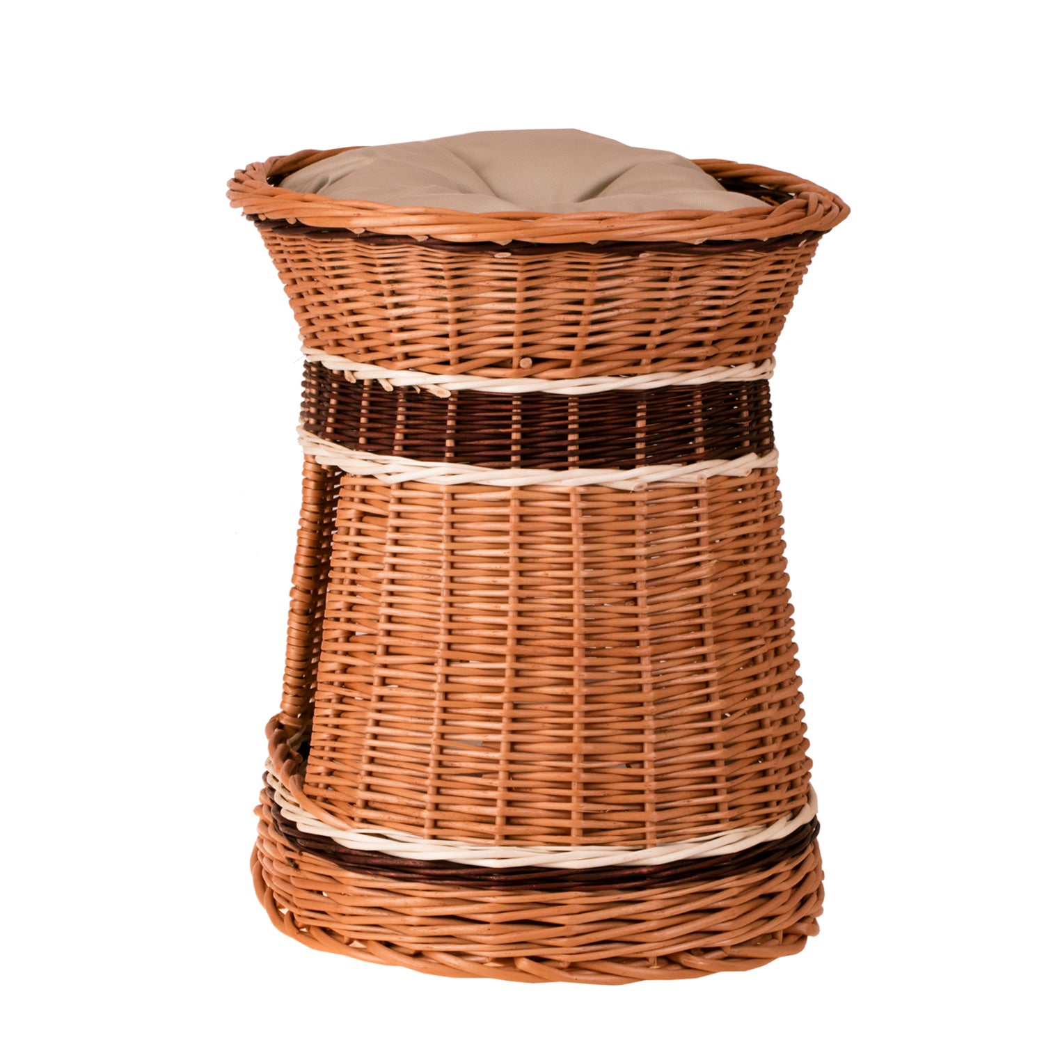 Ten ręcznie pleciony domek-wieża z wikliny zachwyca eleganckim, zwężającym się ku górze profilem i owalną podstawą. Naturalne odcienie miodu, ciemnego orzecha i jasnych, kremowych pasów tworzą harmonijny, wielobarwny efekt. Szeroki frontowy otwór ułatwia wejście, a gęsty, równy splot podkreślają dekoracyjne obręcze. Na dachu znajduje się miękkie legowisko, wewnątrz – przytulna norka.