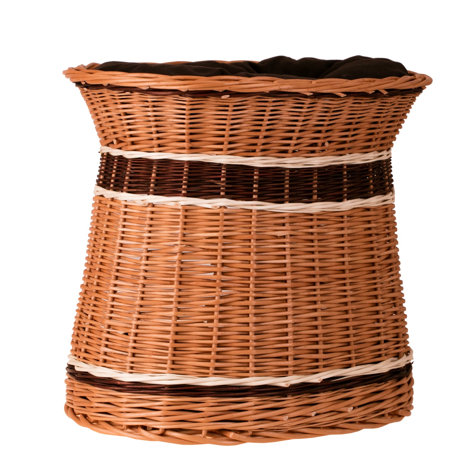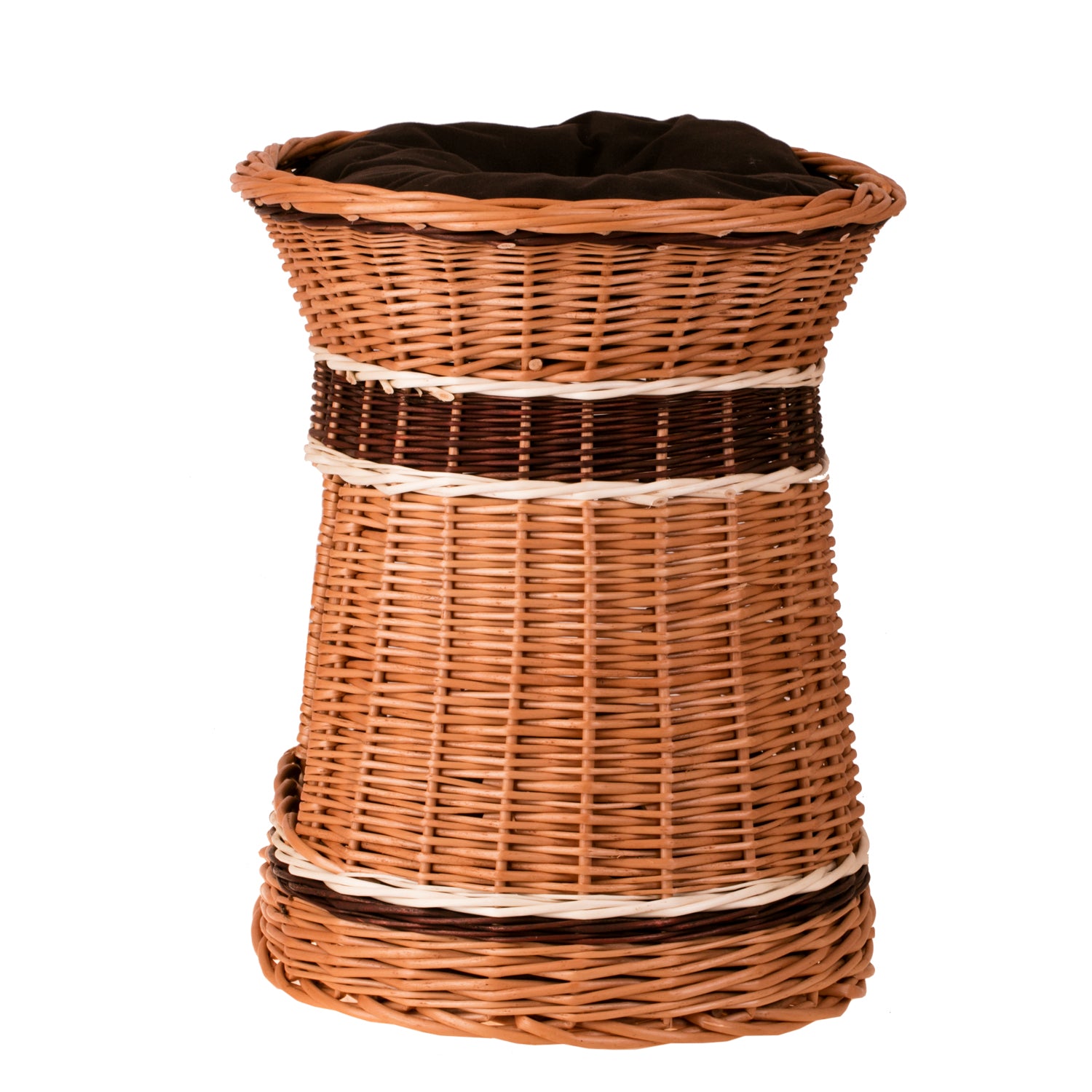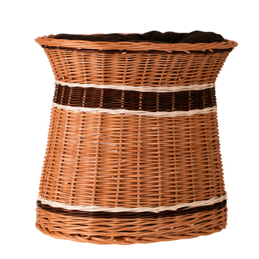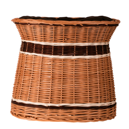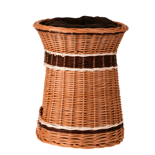 Elegancki wiklinowy domek dla kota i małego psa zachwyca naturalnym wykończeniem i równym, gęstym splotem. Owalna sylwetka lekko zwęża się ku górze, zapewniając stabilną podstawę i szeroki, wygodny rant. Z przodu zaprojektowano obszerne wejście prowadzące do przytulnej kryjówki. Na szczycie znajduje się druga strefa wypoczynku z miękką poduszką, a pasy wikliny w jasnym i ciemnym brązie nadają całości elegancji. Delikatnie falujący brzeg podkreśla rękodzielniczy charakter i zachęca do wylegiwania się po zabawie.