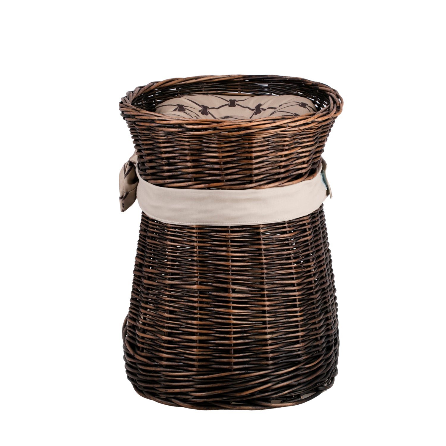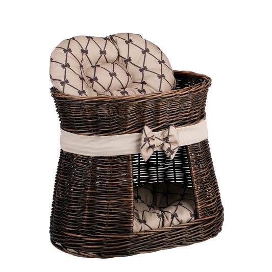 Wyjątkowy kosz dla kota zachwyca elegancją. Ciemnobrązowa wiklina tworzy owalną bryłę z szerokim wejściem na dole i wygodnym tarasem na górze. Równy splot i wywinięty rant podkreślają jakość wykonania. Beżowe obszycie z dekoracyjną kokardą ociepla formę. W zestawie są dwie miękkie, beżowe poduszki; możliwe drobne różnice kolorów.