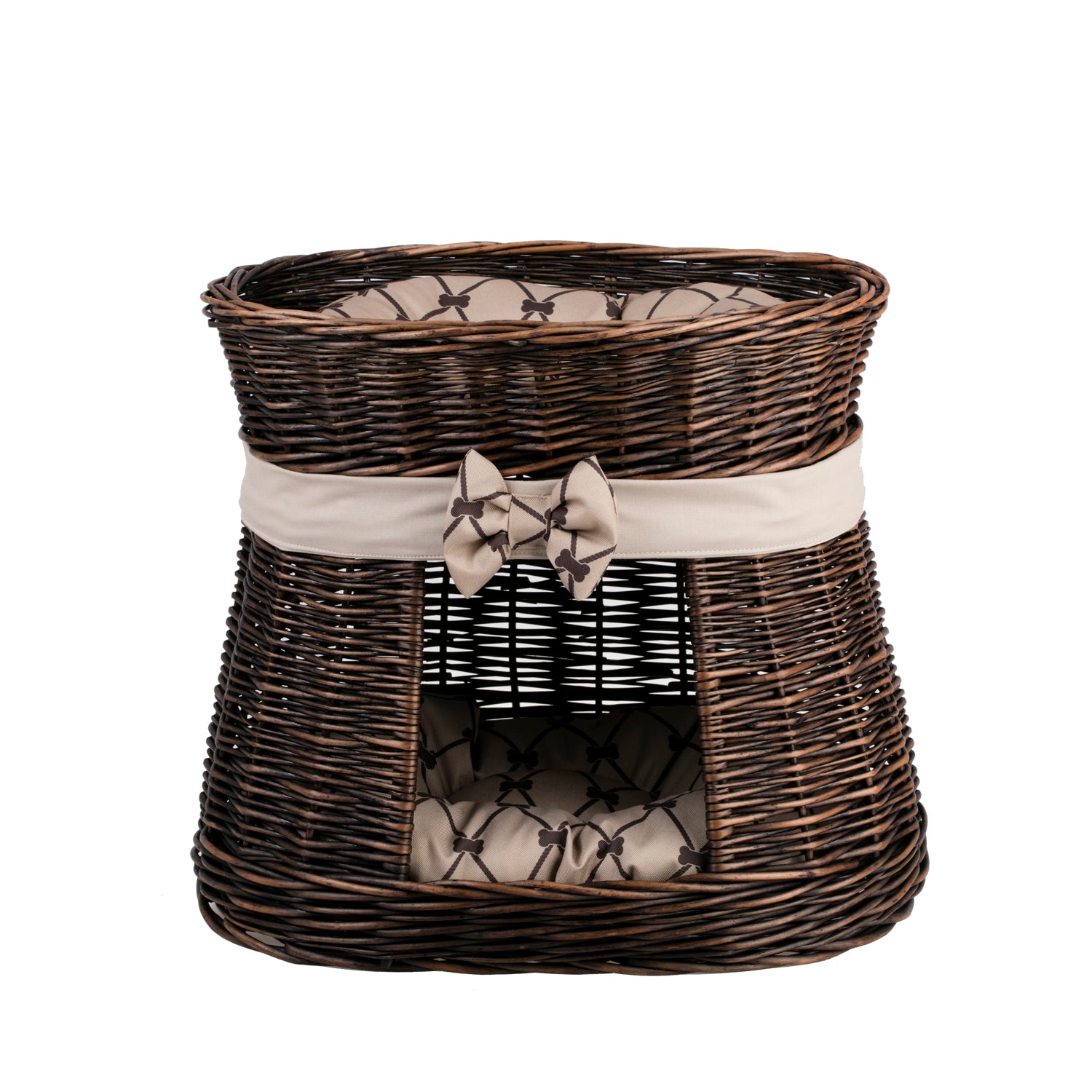 Erif wiklinowy domek dla kota z beżowym obszyciem, dwupoziomowy, z dwiema poduszkami i kokardą TheWickerStories