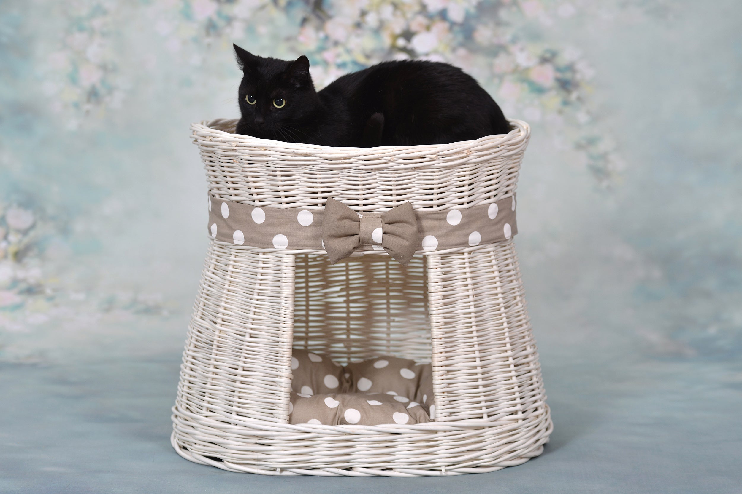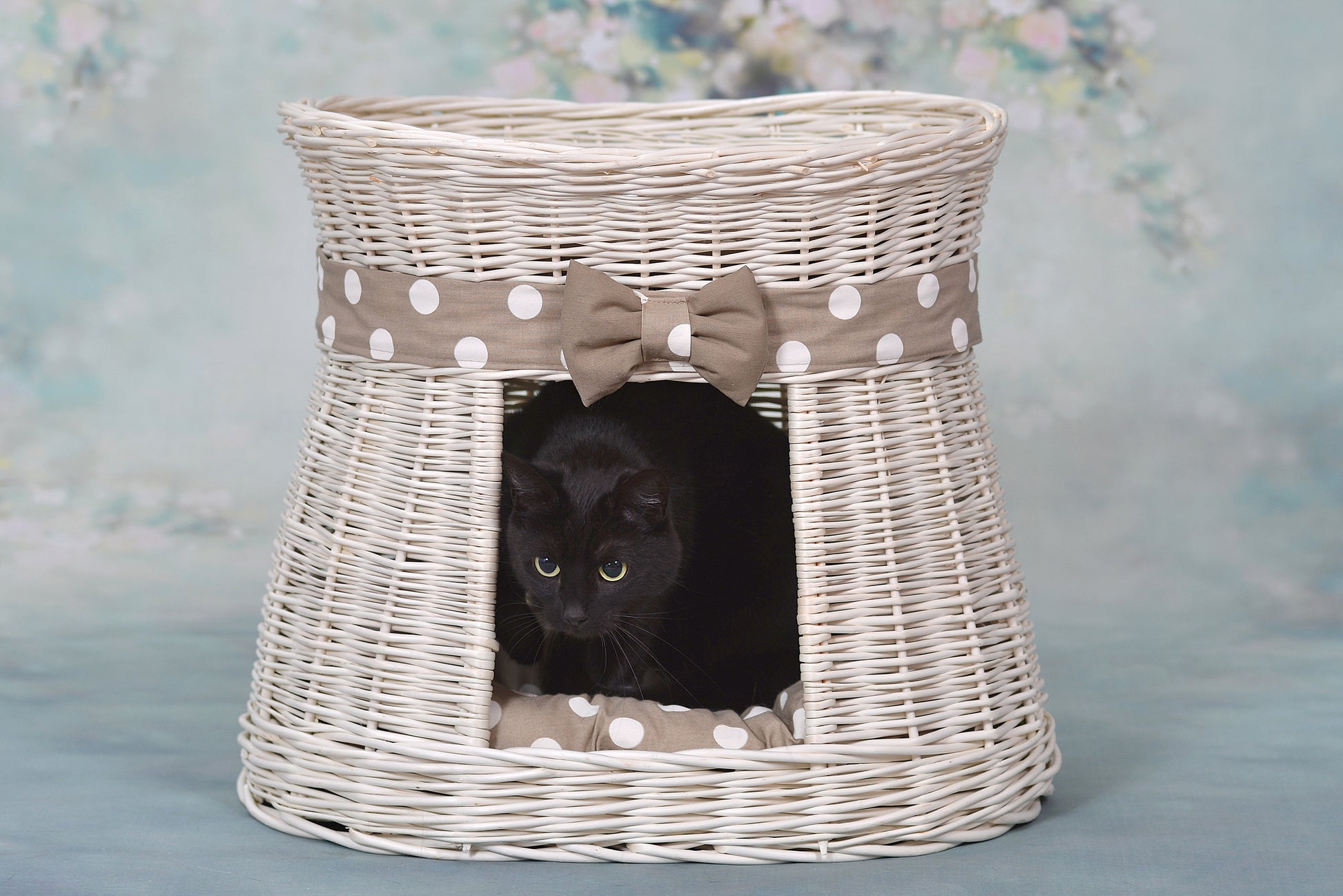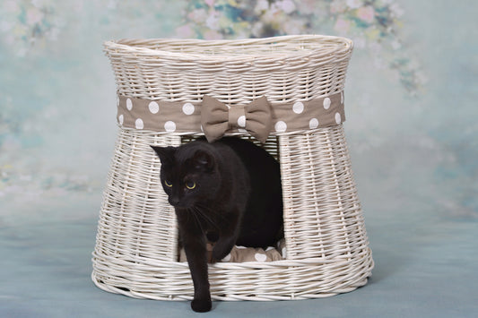 Erif wiklinowy domek dla kota z beżowymi poduszkami, dwie kondygnacje, z kokardą TheWickerStories