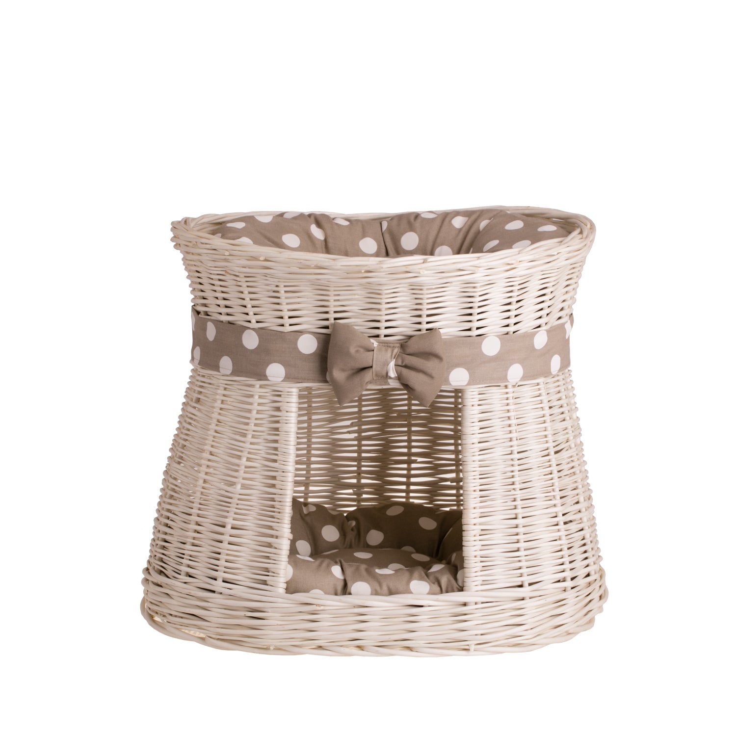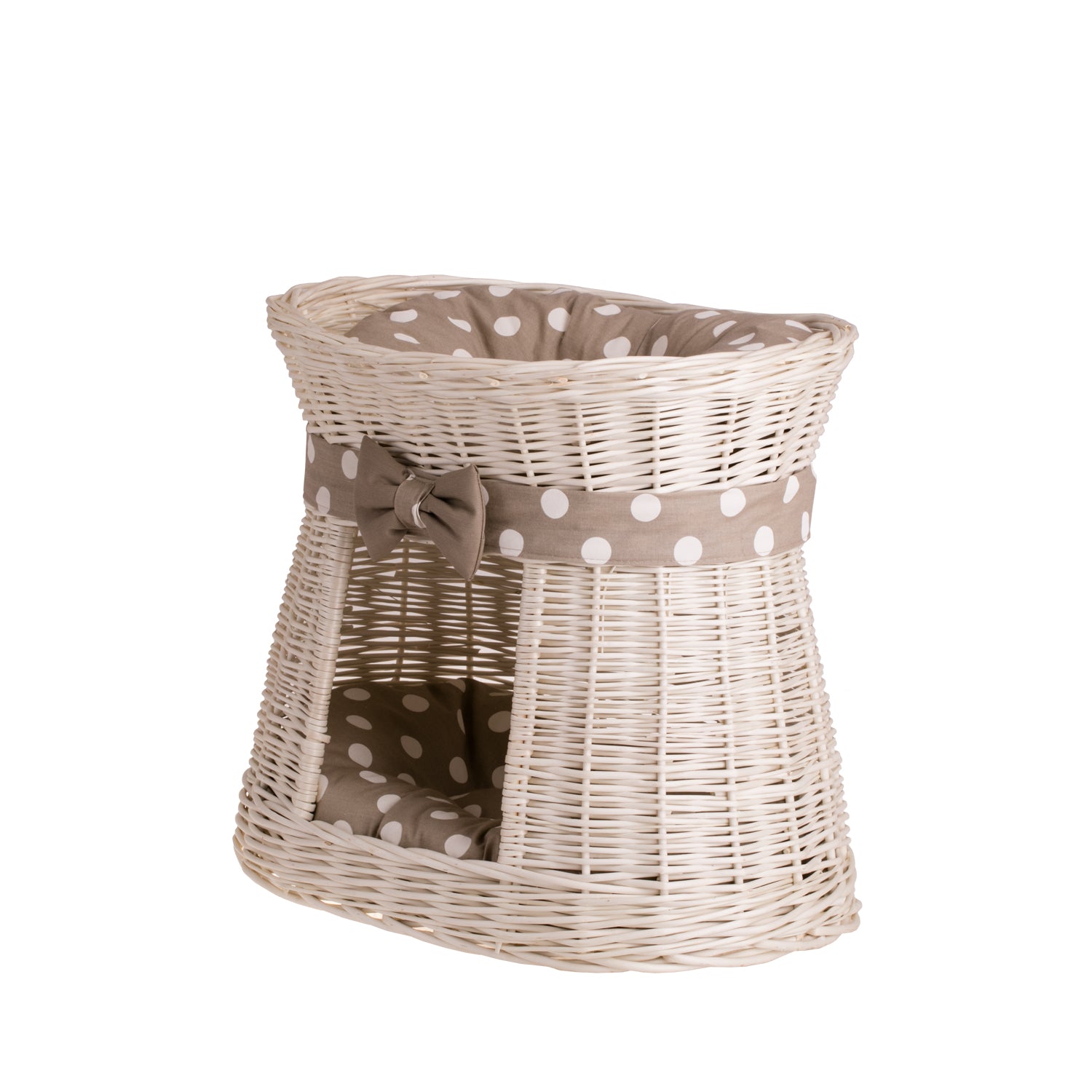 Specyfikacja Twojego Erif wiklinowy domek dla kota z beżowymi poduszkami, dwie kondygnacje, z kokardą TheWickerStories