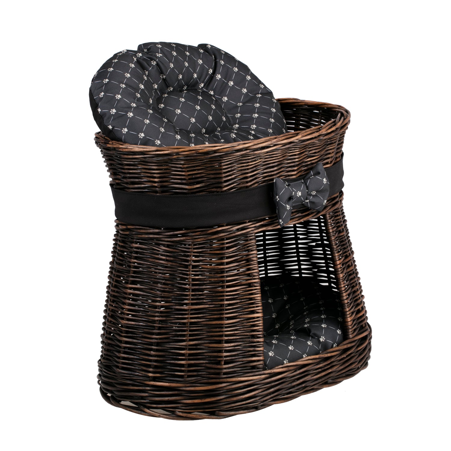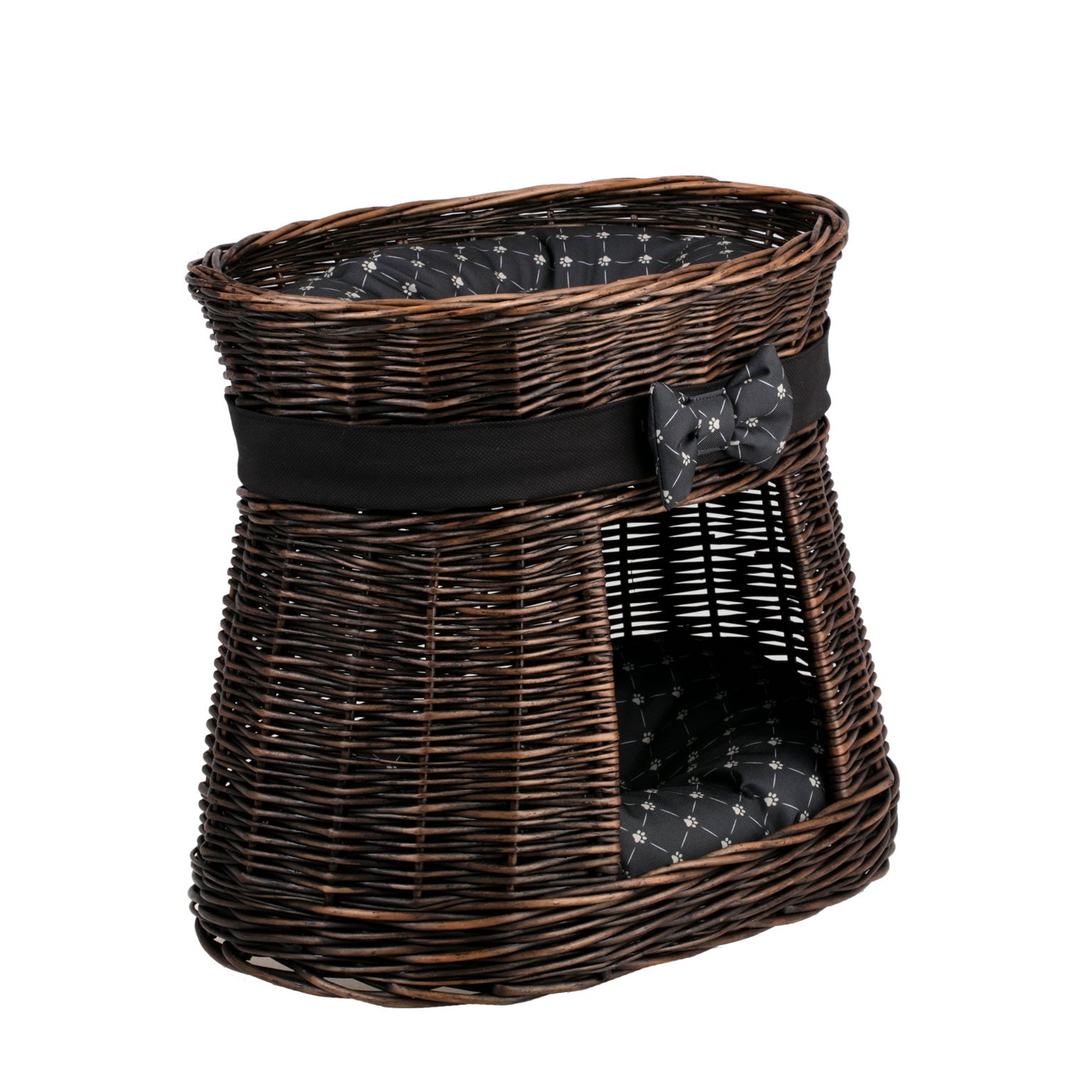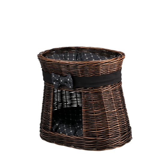 Erif wiklinowy domek dla kota z dwiema kondygnacjami, z poduszkami i kokardą TheWickerStories