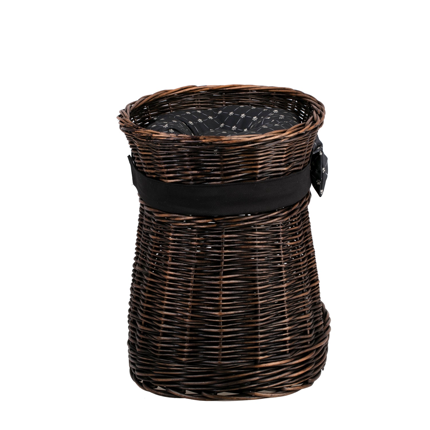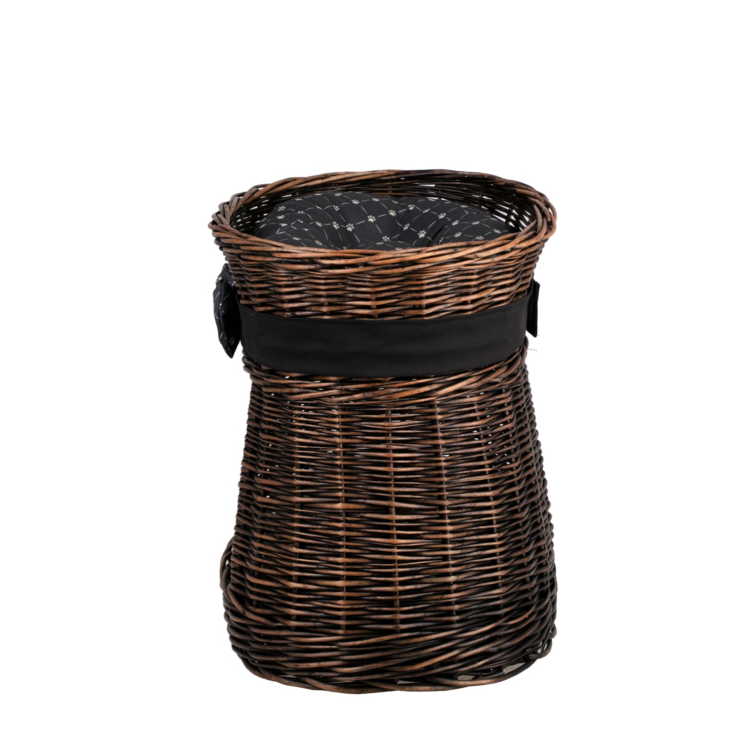 Elegancki, ciemnobrązowy kosz wiklinowy tworzy dwupoziomowy domek dla kota o delikatnie owalnej linii. Dolna część to przytulna norka z wysokimi ściankami, górna – otwarta platforma do drzemek i obserwacji. W zestawie znajdują się dwa czarne, miękkie poduszki z wodoodpornego materiału. Szeroka taśma z kokardą dodaje uroku, a brąz o lekkim połysku podkreśla fakturę splotu. Zaokrąglone krawędzie wieńczy subtelny rant, który porządkuje linię domku.