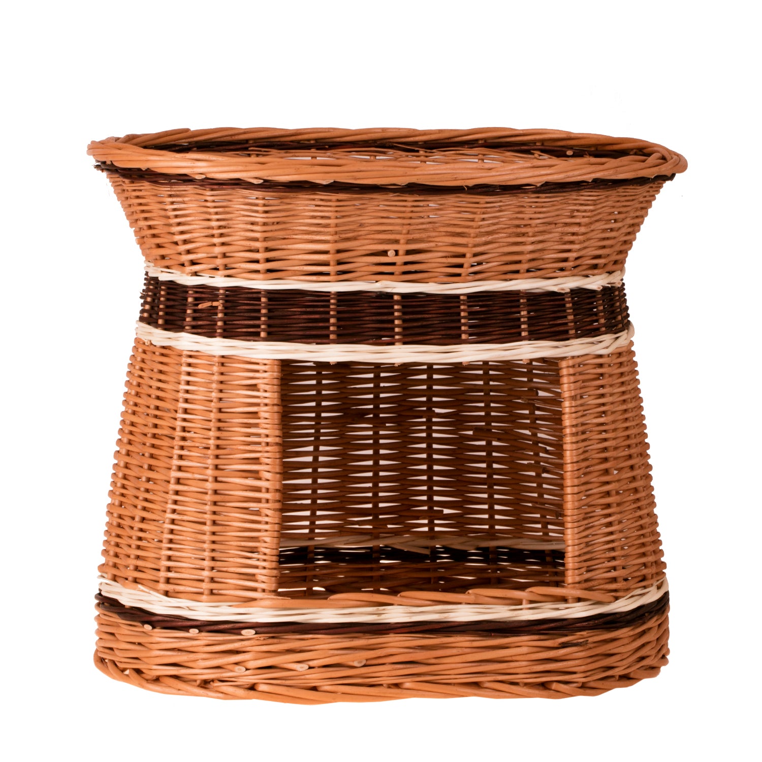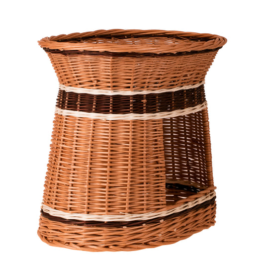 Ręcznie pleciony domek dla kota z naturalnej wikliny zachwyca prostą, klasyczną linią. Korpus ma zgrabną, owalną formę z szerokim wejściem na dole i otwartą półką na górze. Ażurowy splot dodaje lekkości, a staranne przeploty stabilizują ścianki. Górny rant tworzy płaską powierzchnię – idealny taras do obserwacji. Produkt dostarczany jest bez poduszki.