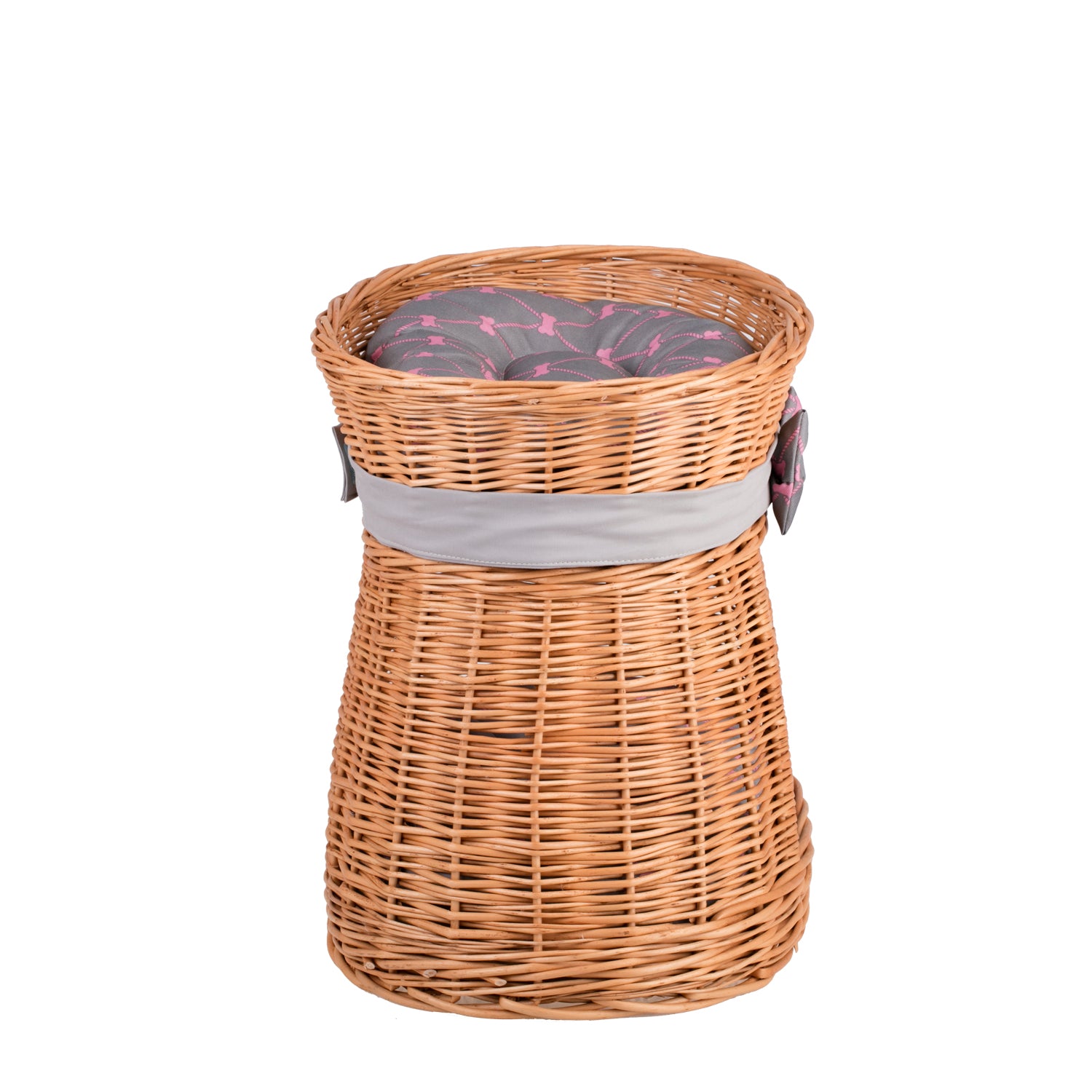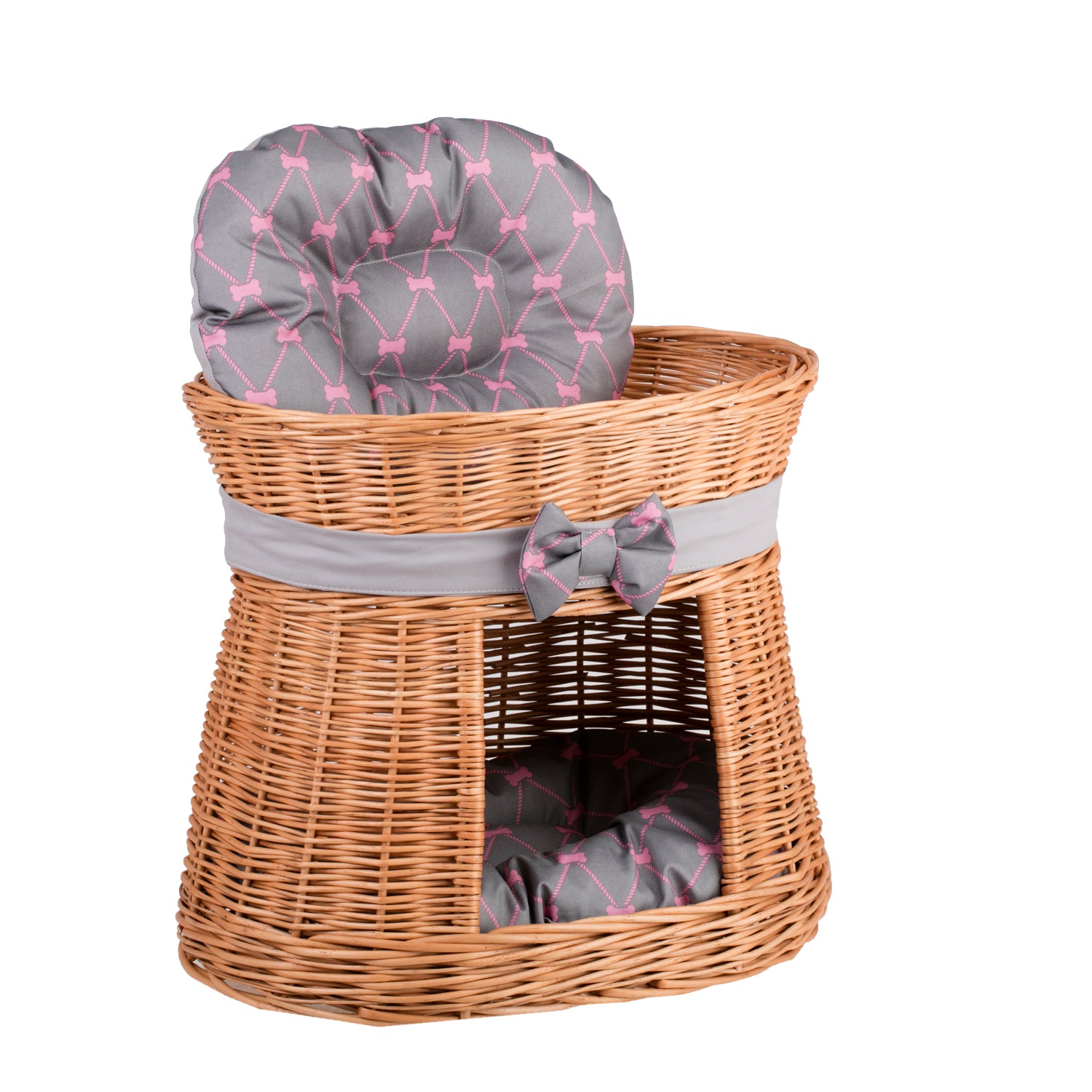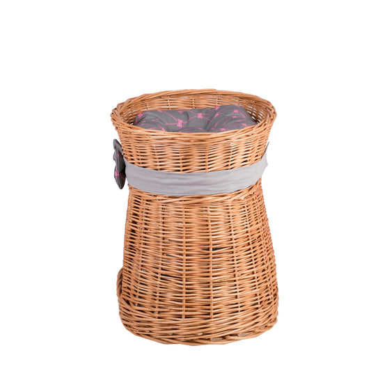 Erif wiklinowy domek dla kota z dwoma poziomami, z szarymi poduszkami i kokardą TheWickerStories
