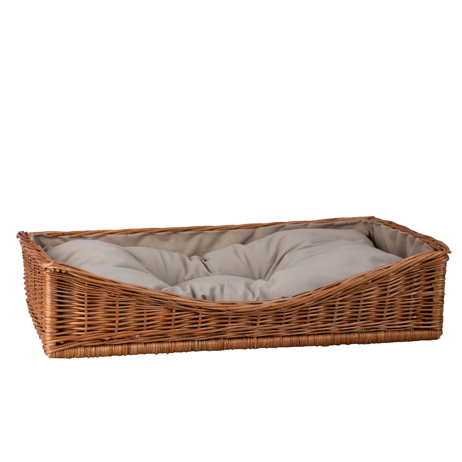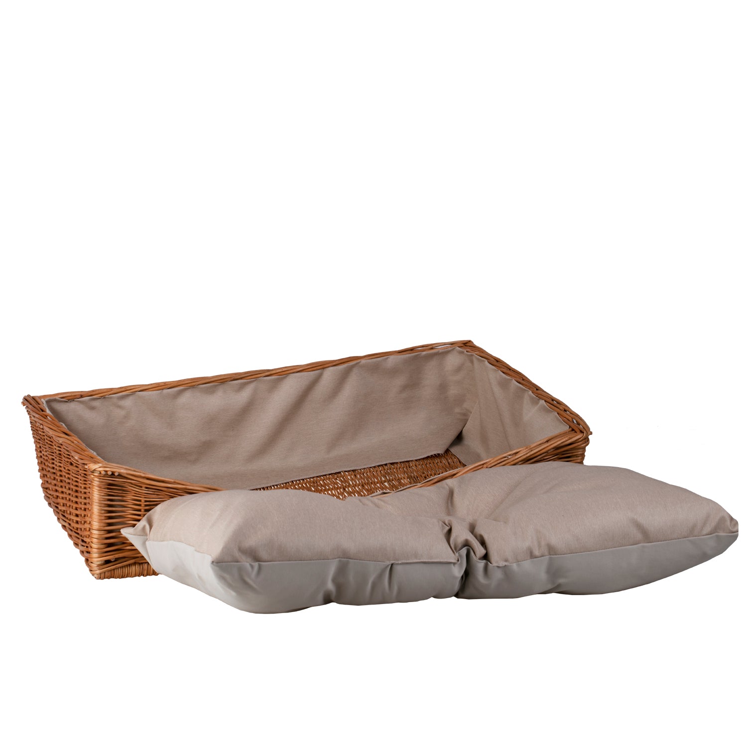 Prostokątne legowisko z naturalnej wikliny ma lekko obniżony front, który ułatwia wejście, oraz równy, gęsty splot po bokach. Ten kosz wiklinowy prezentuje stonowaną, domową estetykę. Wnętrze wyłożono beżowym obszyciem dopasowanym kolorystycznie do plecionki. W zestawie znajduje się gruba i miękka poduszka, która stabilnie leży w koszu i zaprasza do długich drzemek.