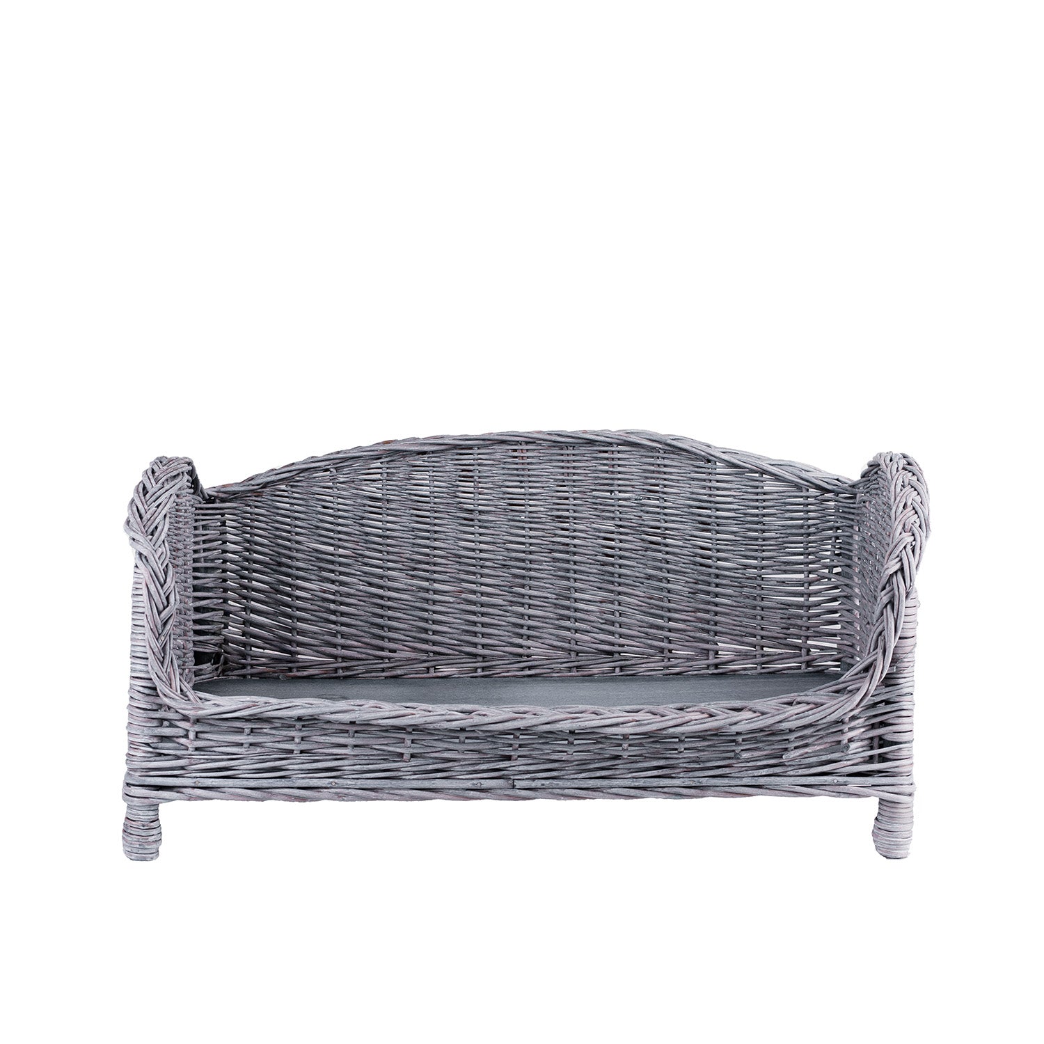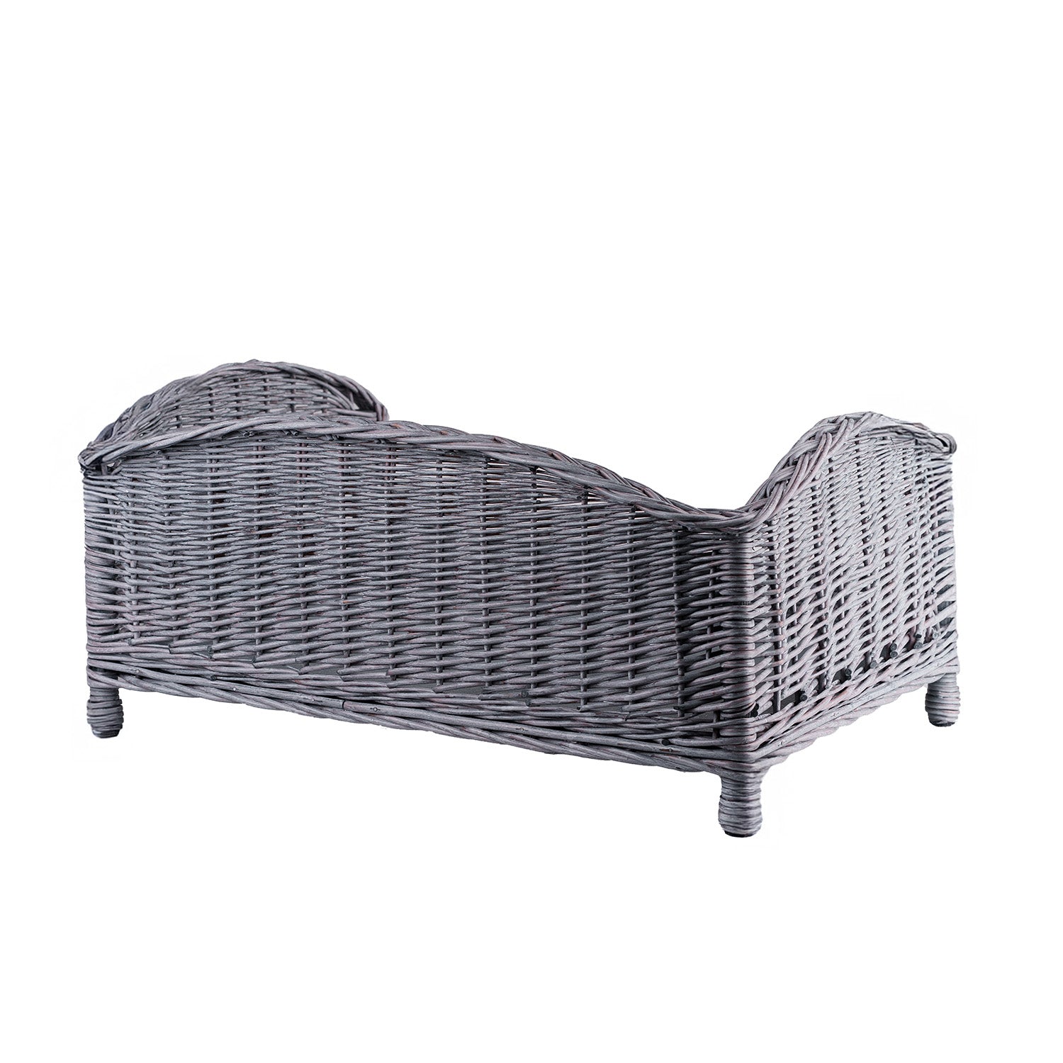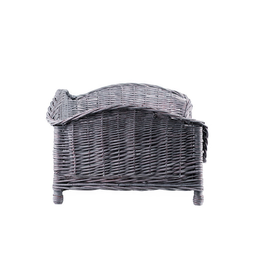 Eleganckie, szare legowisko z wikliny prezentuje się jak mini sofa dla pupila. Ma pełne oparcie i wyższe boki, a z przodu praktyczny, obniżony brzeg ułatwiający wejście. Gęsty, równy splot tworzy stabilną, estetyczną ramę, a dekoracyjne przeploty na krawędziach dodają szyku. Zaokrąglone, gładkie krawędzie są bezpieczne dla łap. Przednia krawędź jest delikatnie uniesiona, by poduszka nie przesuwała się podczas odpoczynku. Wewnątrz leży miękka poduszka dopasowana do dna kosza.