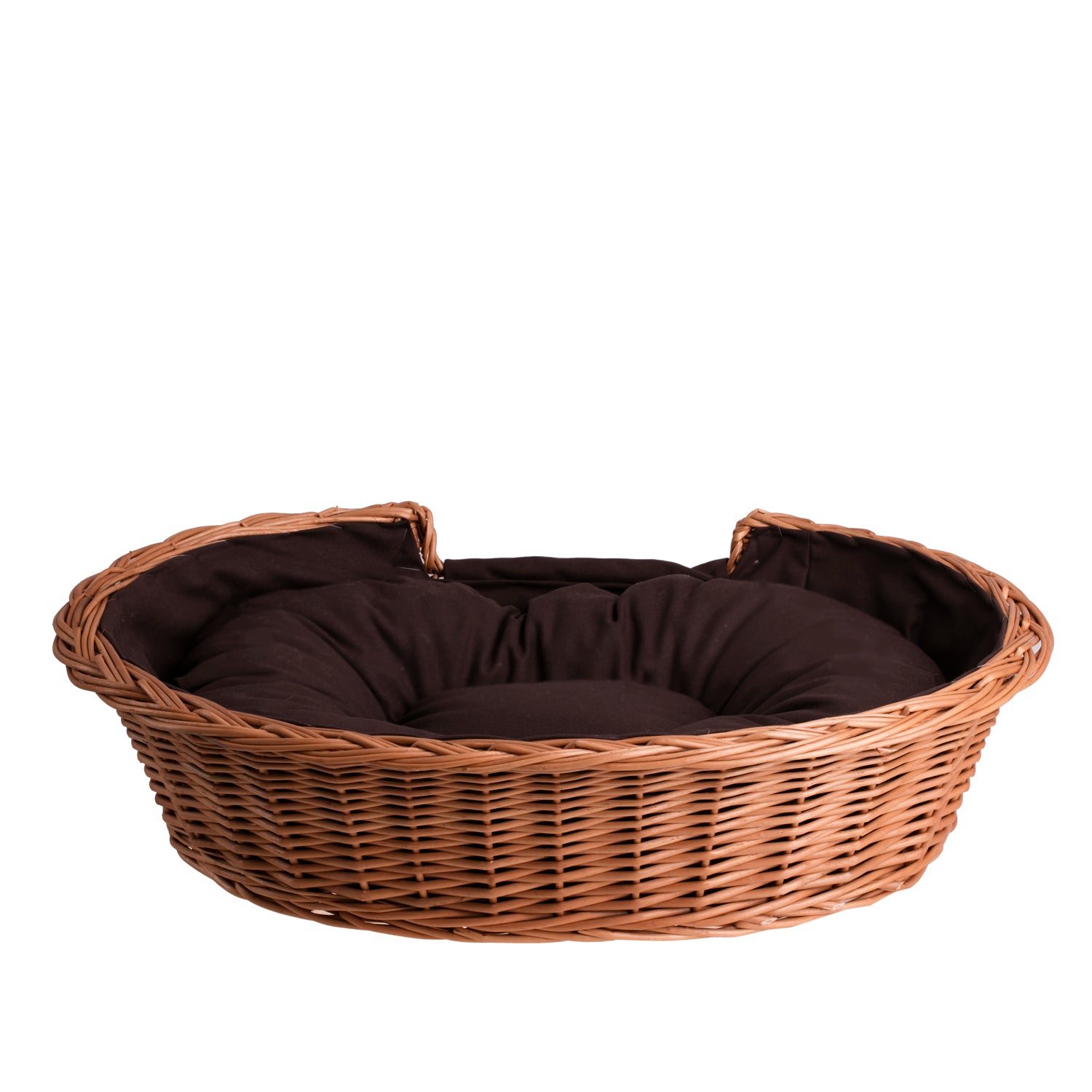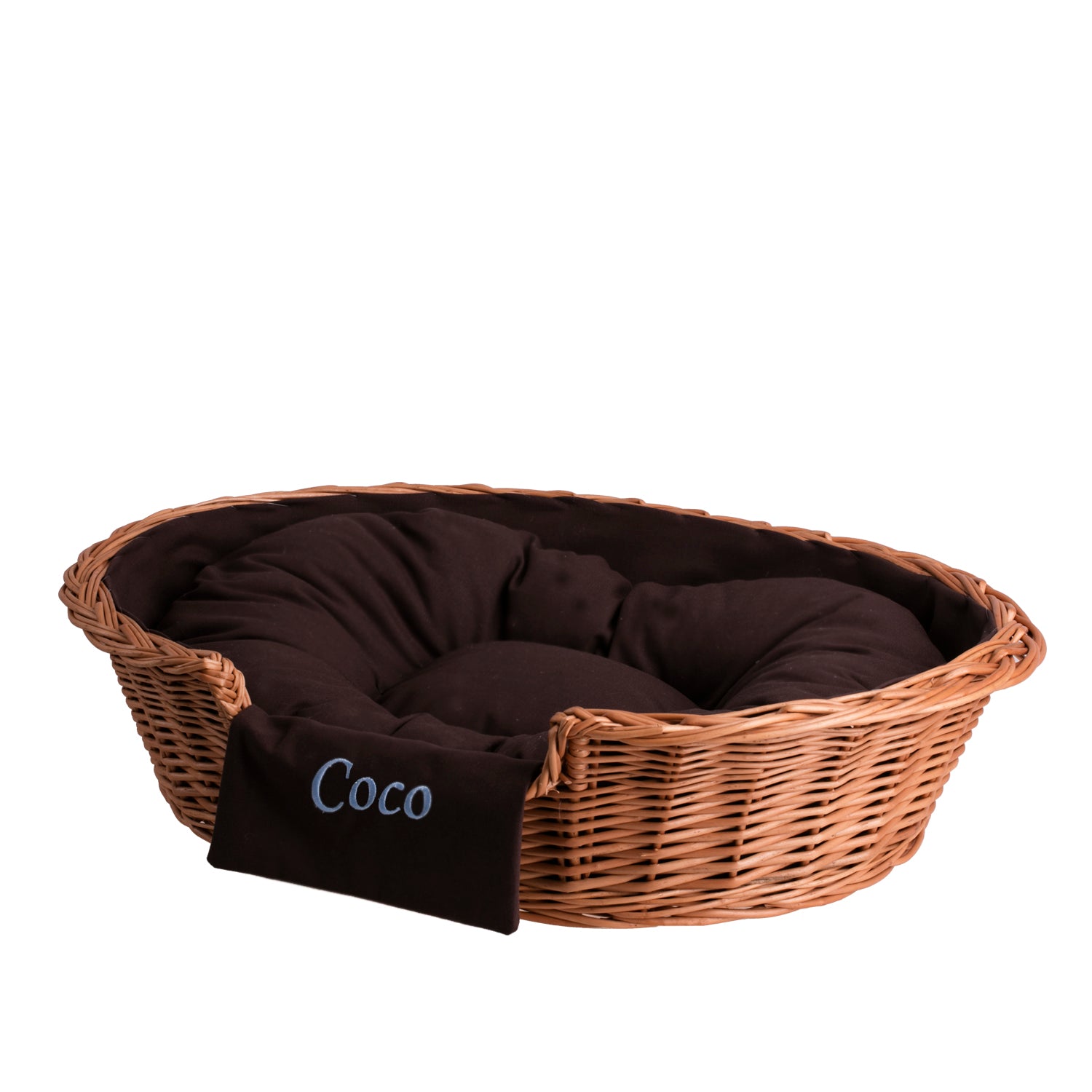 Esmira wiklinowy kosz dla psa i kota z brązową poduszką, personalizowany TheWickerStories