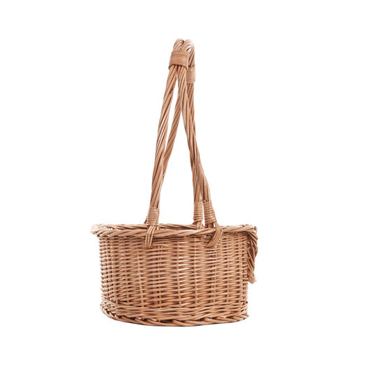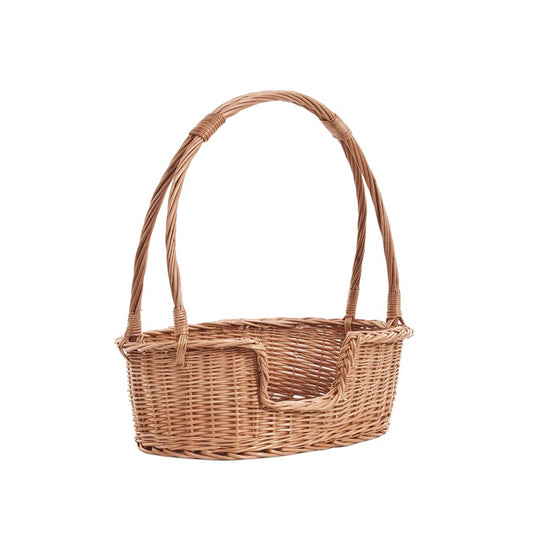 Eleganckie legowisko z wikliny ma klasyczną, otwartą formę z wysoką rączką do wygodnego przenoszenia. Gęsty, równy splot tworzy stabilne ścianki, a obniżony przód ułatwia wejście. Krawędzie są starannie wykończone i gładkie. W zestawie znajduje się miękka, dopasowana poduszka w kolorze szarym, która dodaje przytulności i harmonijnie pasuje do każdego wnętrza. Materiał ma jasny, naturalny odcień, a wyrazista plecionka podkreśla ponadczasowy charakter kosza.
