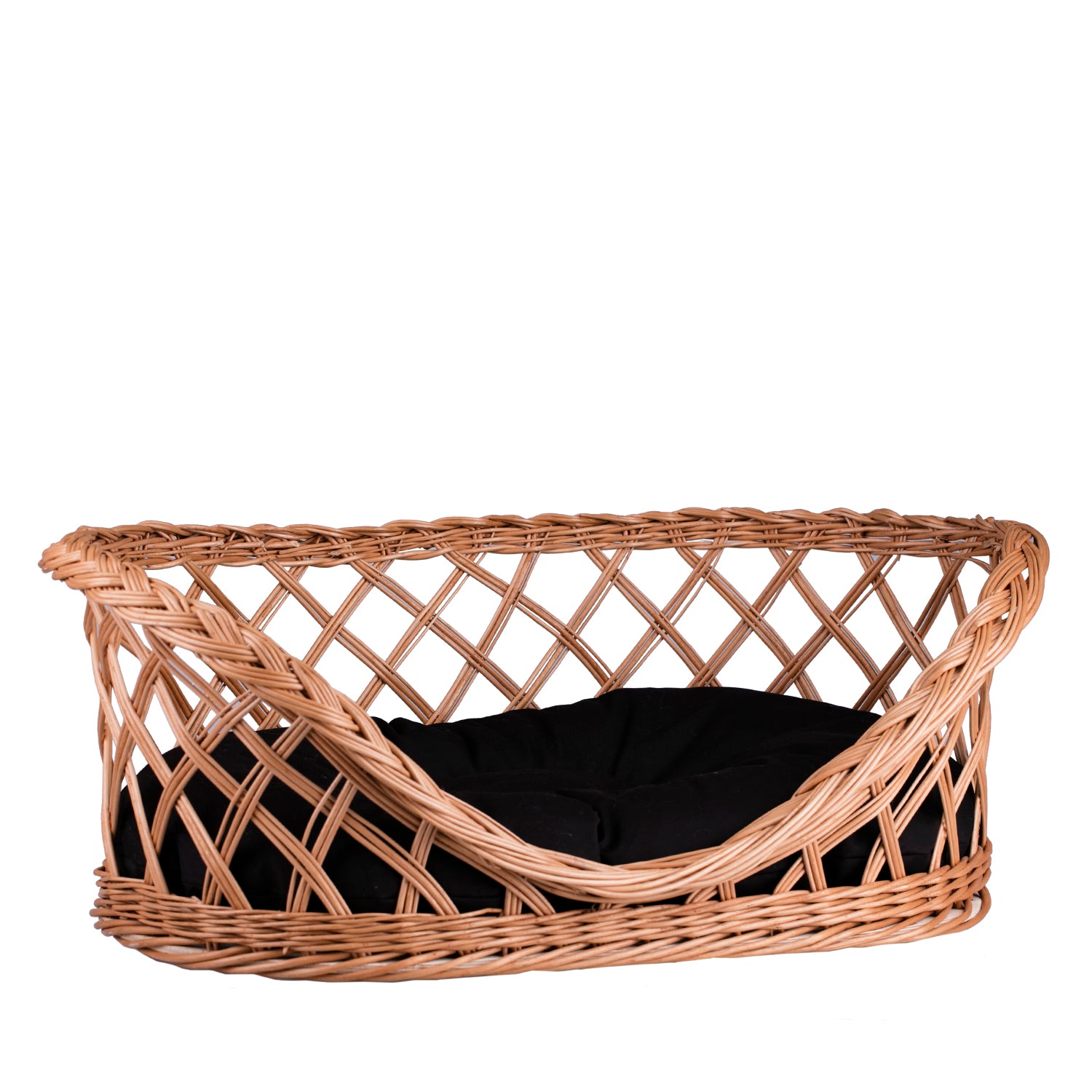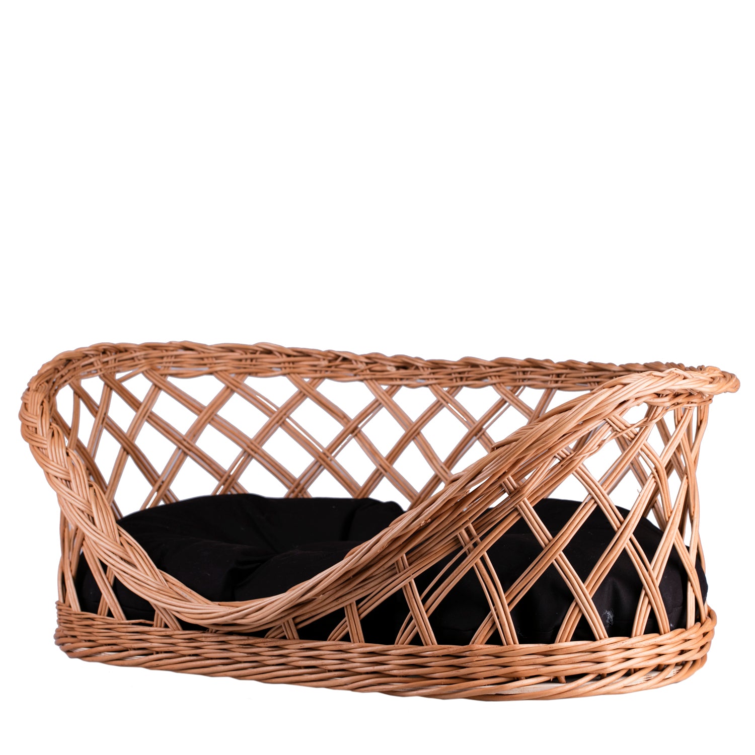 Esnoria wiklinowy kosz dla psa i kota na legowisko z czarną poduszką i niskim wejściem TheWickerStories