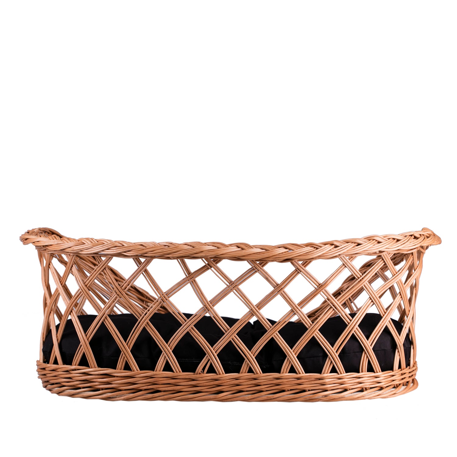 Naturalne legowisko dla psa i kota zachwyca lekką, ażurową formą i starannym, krzyżowym przeplotem wikliny. Harmonijnie wygięte ścianki z elegancko oplecioną krawędzią tworzą przytulną przestrzeń wypoczynku. Przód jest niższy, co ułatwia wchodzenie, a wewnątrz znajduje się miękka, brązowa poduszka dopasowana do dna.