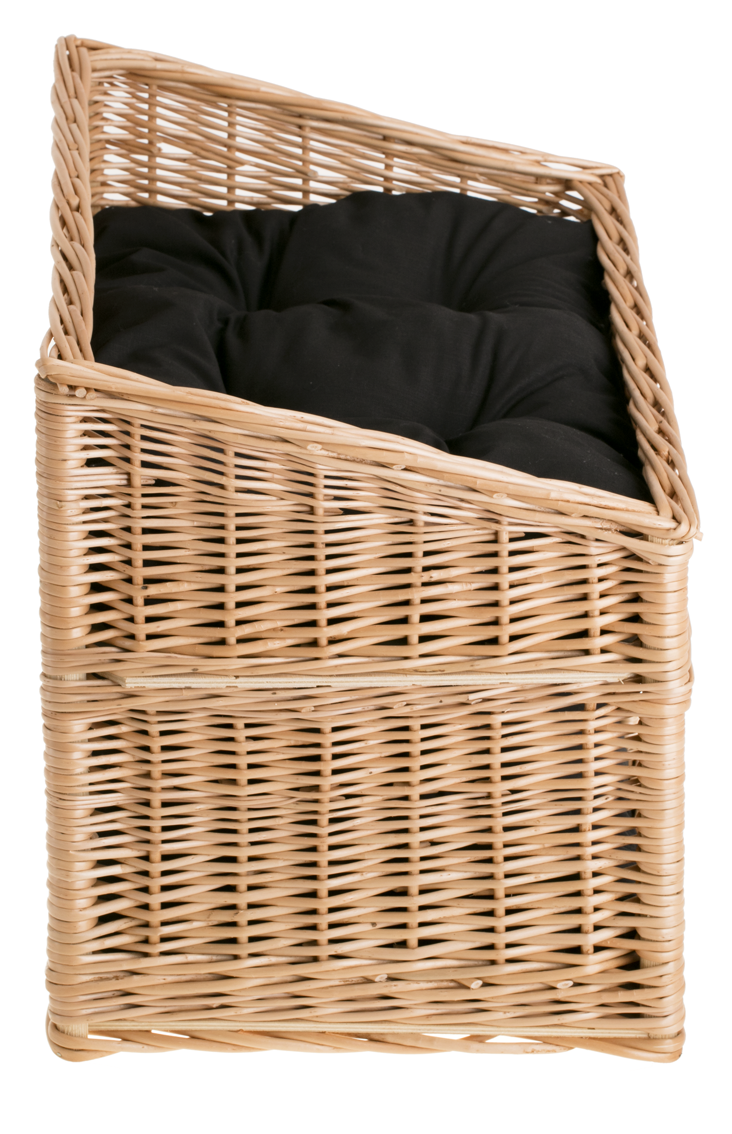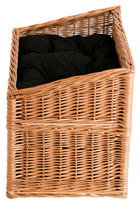 Ten wiklinowy domek dla kota zachwyca czystą formą i dopracowanymi detalami widocznymi w każdym przeplocie. Dwupoziomowa konstrukcja oferuje osłoniętą dolną przestrzeń z szerokim wejściem oraz ozdobnym okienkiem z kratką, a na górze wygodną platformę z podwyższonymi ściankami. Gęsty, równy splot nadaje mu lekkości, a jednocześnie zapewnia stabilność. W zestawie są dwie miękkie poduszki.