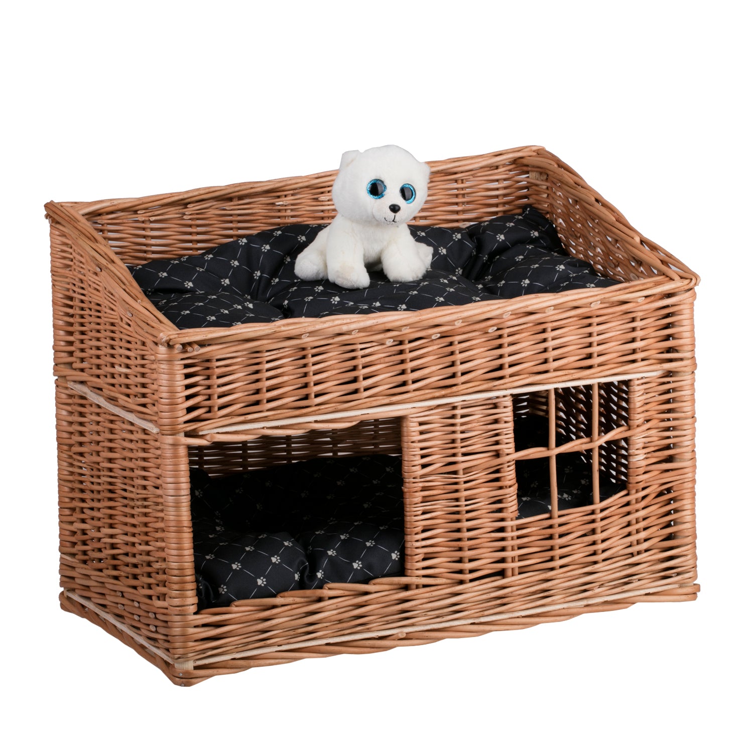 Estrella wiklinowy domek dla kota z dwoma wodoodpornymi poduszkami, tarasem i okienkiem TheWickerStories