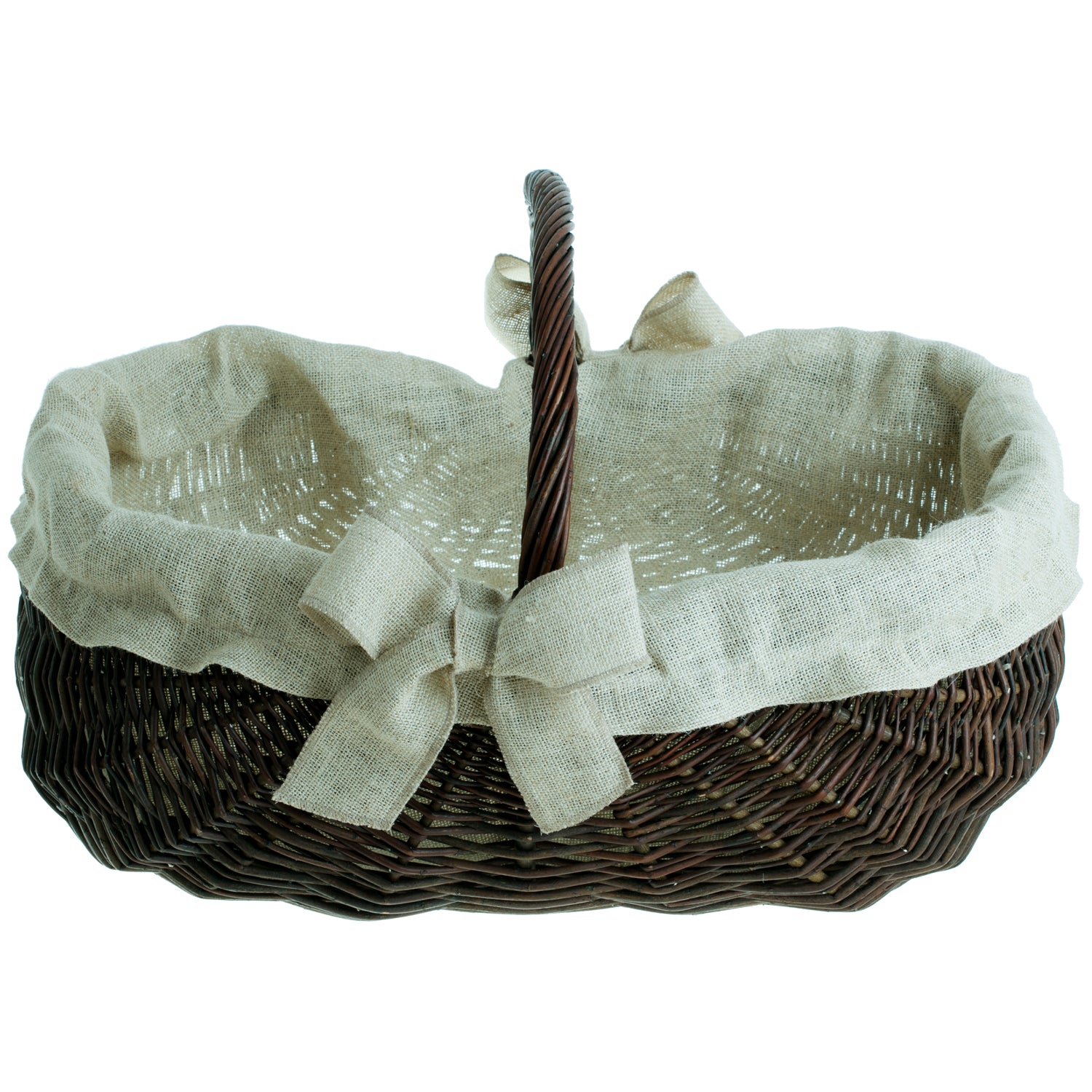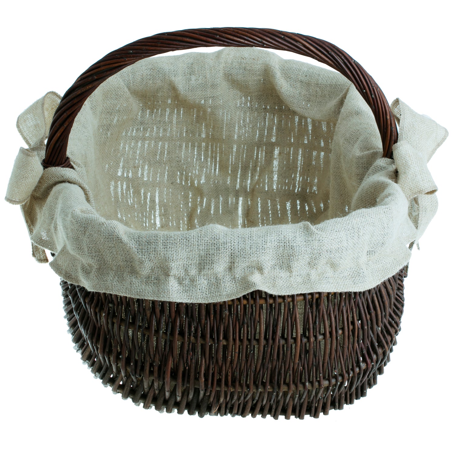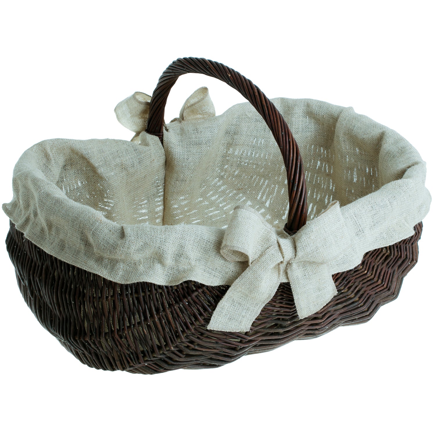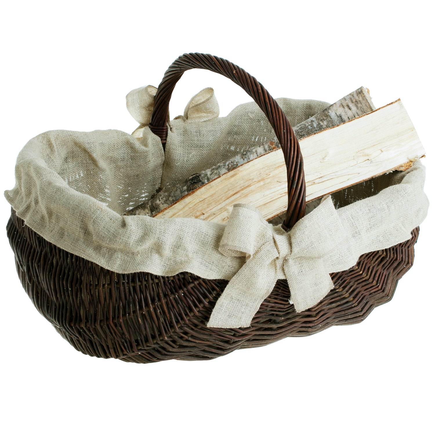 Duży kosz kominkowy z ciemnej, nieokorowanej wikliny zachwyca naturalnym, eleganckim wyglądem. Głęboki brąz podkreśla rysunek kory, a równy, gęsty splot wzmacnia ścianki i dno. Sztywna, łukowata rączka zapewnia pewny chwyt. Wnętrze wykończono jutowym obszyciem w kolorze lnu, związanym dekoracyjnymi kokardami, które dodają subtelnego uroku.